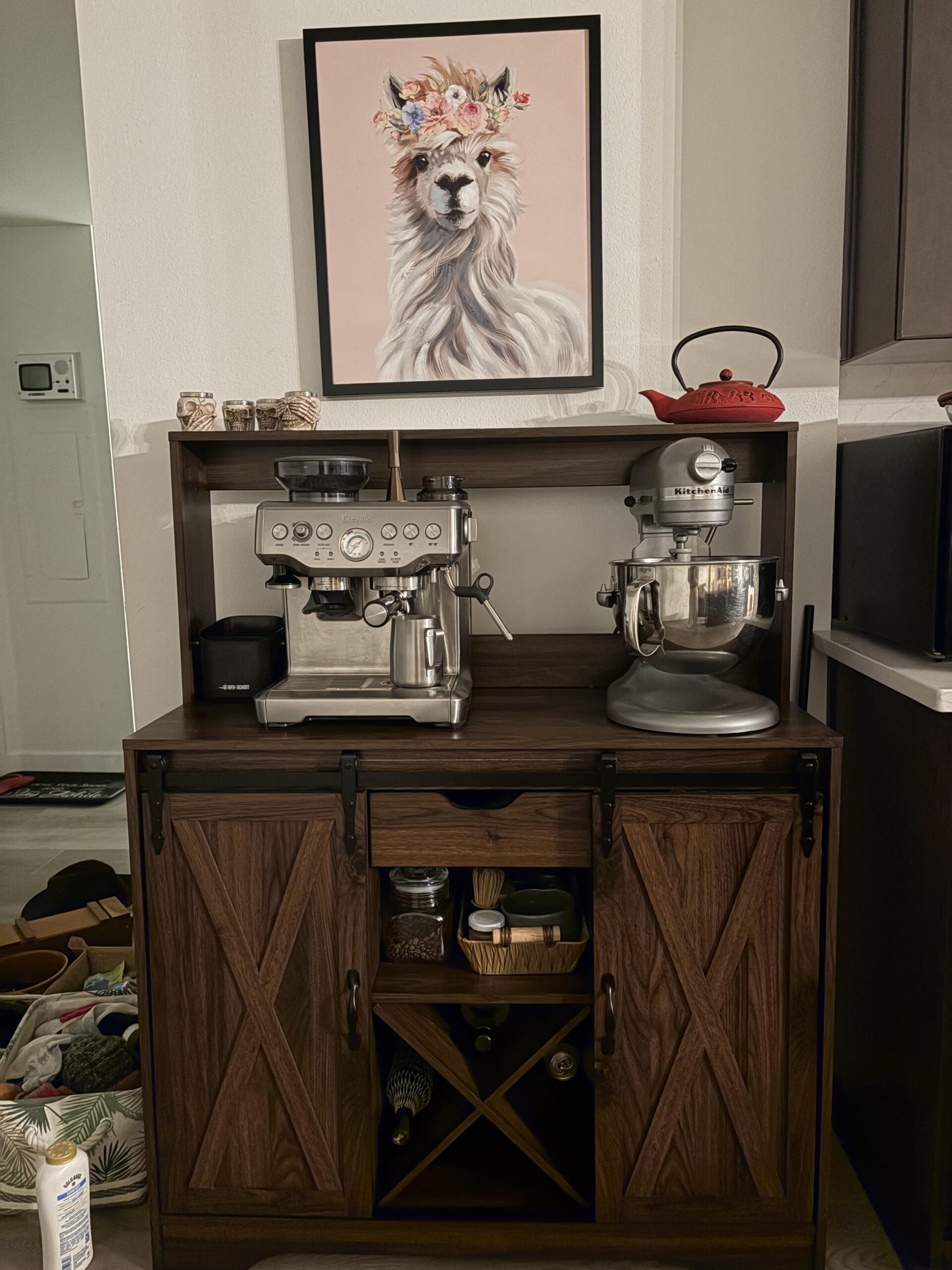 And as much as I love your painting get a horizontal one maybe or center the painting and put a plant on one side of the upper shelf and maybe a bowl or something decorative on the other side of the upper shelf. I donβt hate the tea pot but maybe put it down next to the coffeemaker. I have this same coffee machine. I love the instant hot water part. So good for making tea. β€οΈ