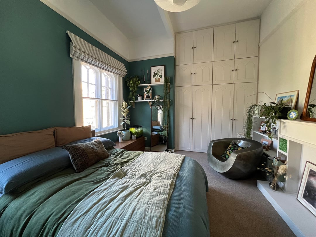 But the bedroom has stumped me, I chose the deep tealy blue before moving in and had lived with it for two years, and even though I do still love that as a colour I realised quickly I didn’t like it for this space as it’s north facing and just felt too cold/dark particularly through the winters. So I recently just used some leftover “beige white” to knock out the blue and reset the space. My instinct is telling me to paint the ceiling an above the picture rail in a warm colour, and keep the lower walls fairly bright and neutral (though I do think they need to go a little darker than they are right now as I don’t like the lack of contrast between the blinds and window frames)