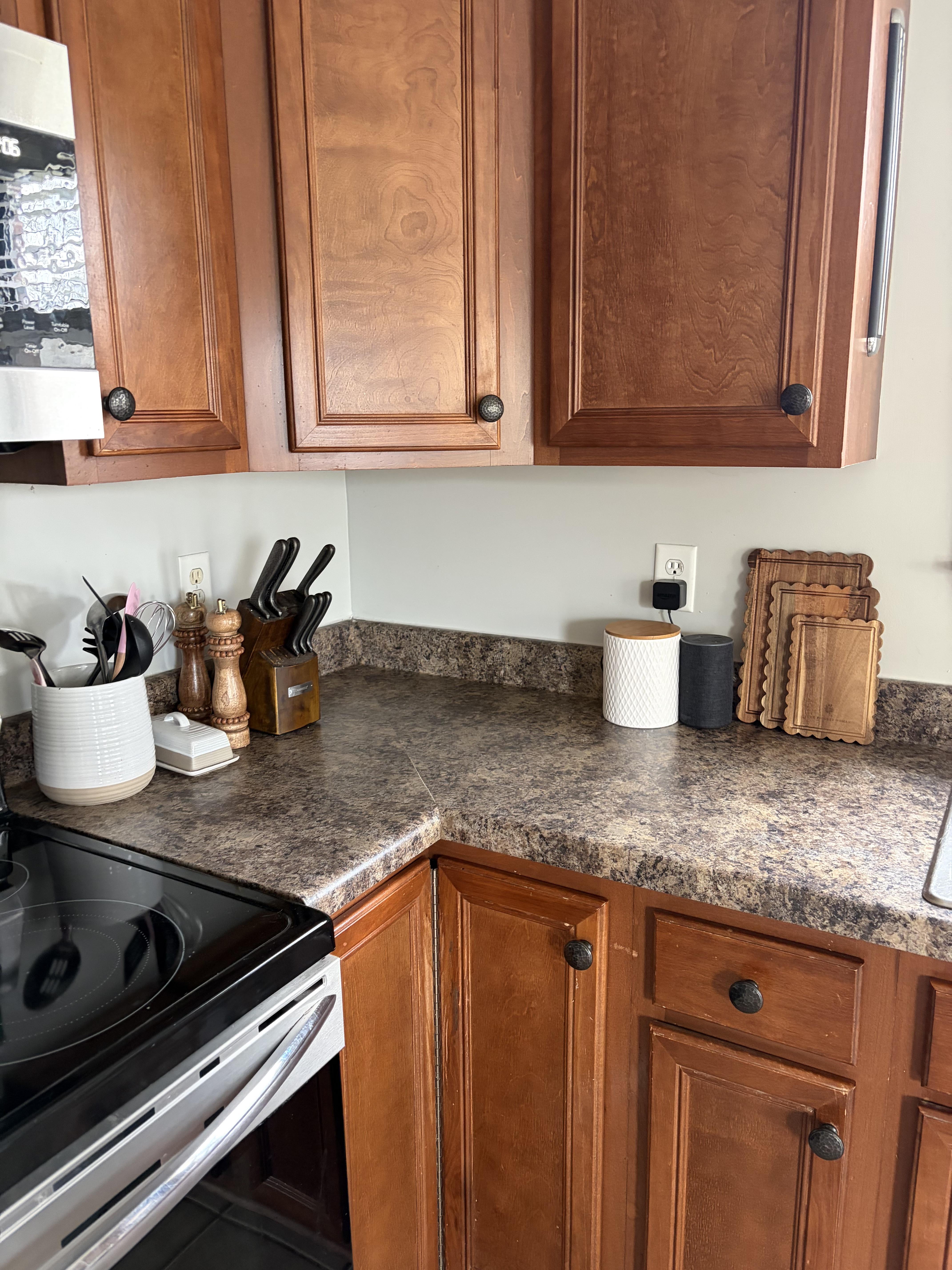 The items are nice but the placement doesnt really work, in my oppinion, Also everything is kinda of too matchy matchy, gotta add something to break it up, a very green plant, or some sort of nice potery that is colorful, to bring a little vibrancy to the area. Cook books are also nice to display, they are usually colorful.