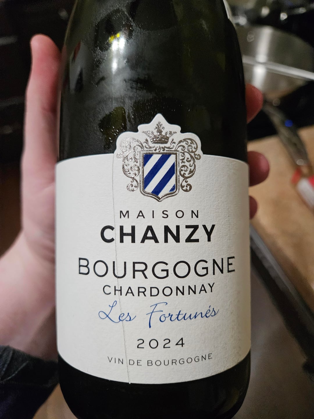 Here poured is a 2024 Miason Chanzy chardonnay. This is my first time trying white wine. I love it way more than I was expecting. It tastes very refreshing; I feel like I should be on a beach with this. I still don't understand how to give flavor notes. I feel like it tastes appley. Like green apple. I hope that is good enough.