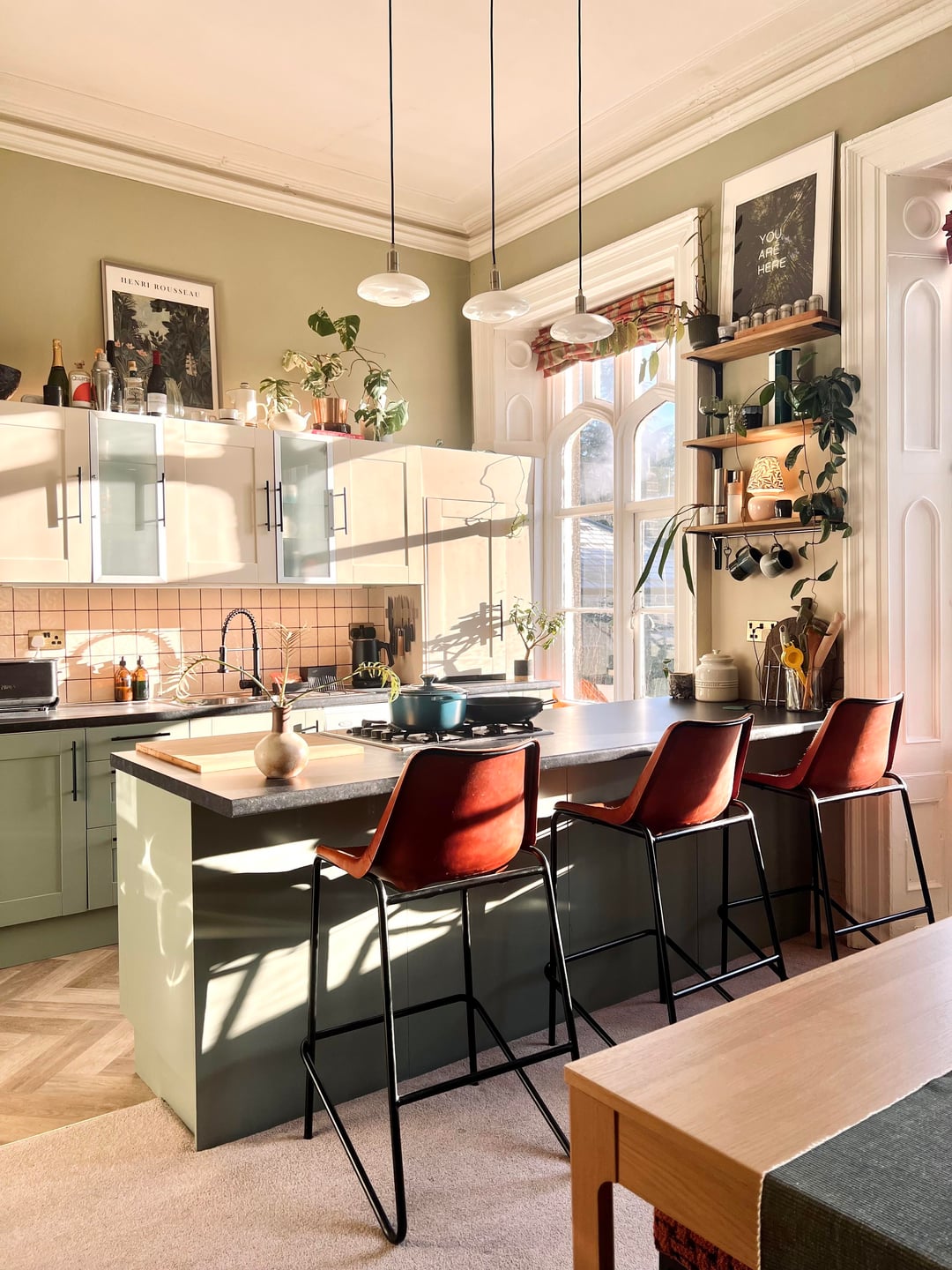 Cabinet colours are Joas White and Card Room Green by farrow and ball. Initially after painting the green cabinets I thought I needed to change the wall colour as you could say they clash a bit, but over time I’ve grown to love the unexpected pairing 🥰