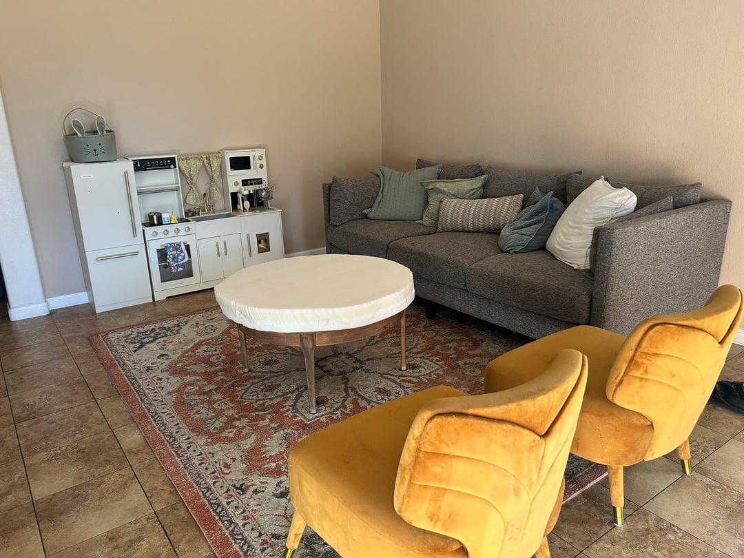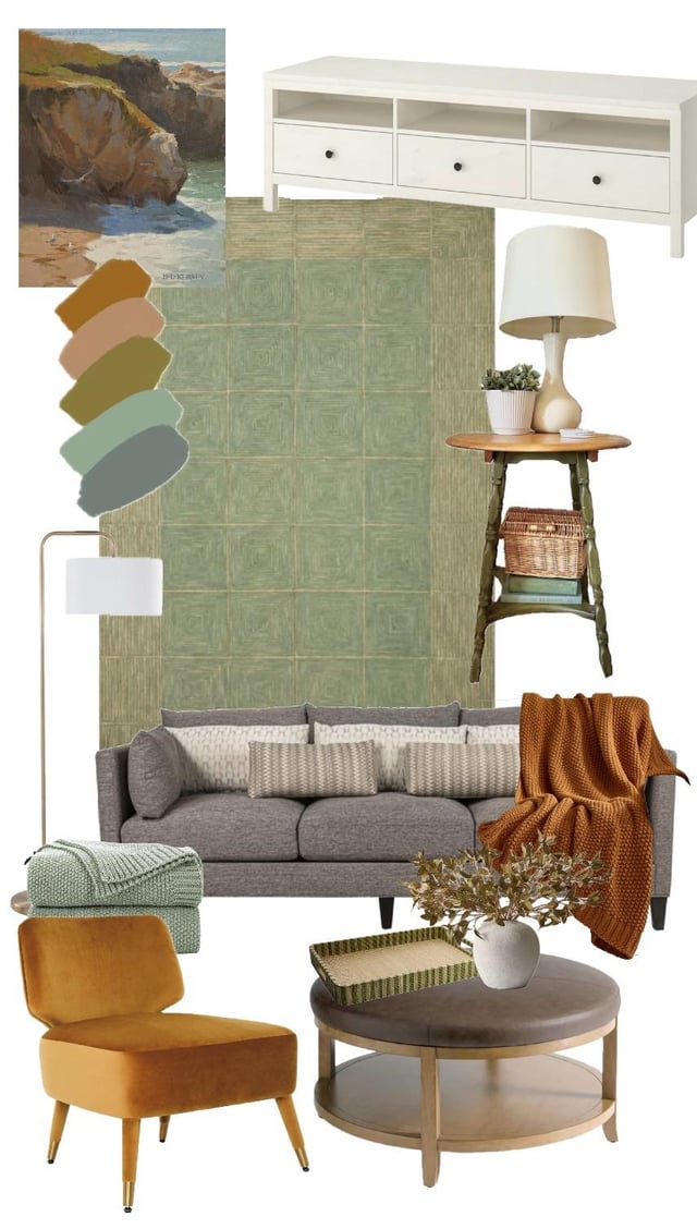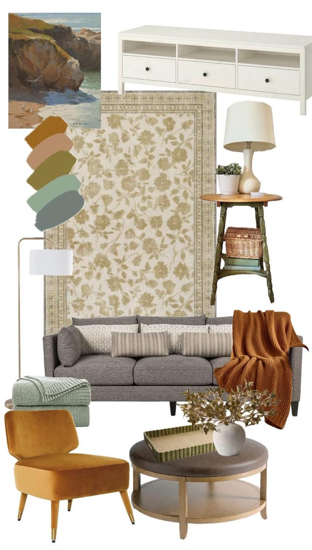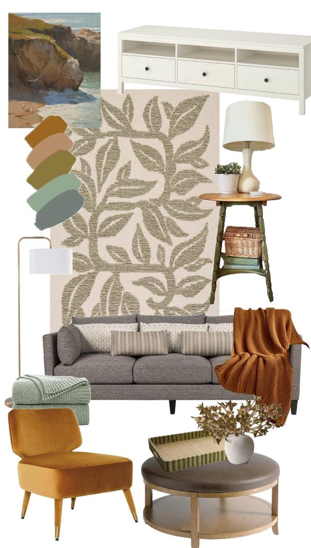 Please note, the last photo shows the current state of my living room. We are trying to reupholster the ottoman. I will be replacing the throw pillows on the couch to the ones in my moodboard. The velvet chairs do not photograph well with the sunlight and appear yellow but they are actually copper. They’re side by side right now because of my toddlers kitchen. Yes, I know it looks all over the place.