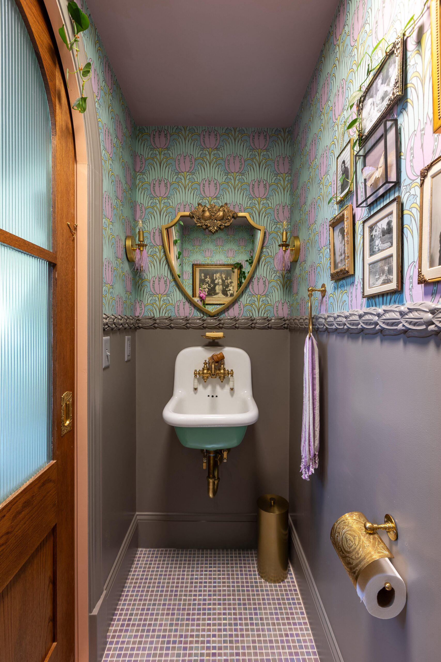 A (not pictured) sun tunnel on the ceiling brings natural light into this “landlocked” powder room featuring Tulip & Bird wallpaper by CFA Voysey c.1895