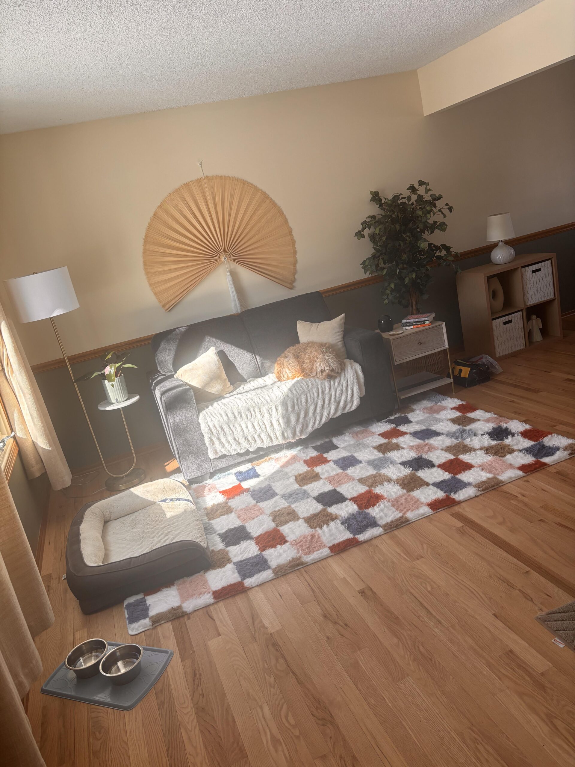 💙2 solid light blue pillows (no pattern) that are a bit fluffy and a similar light blue color as the one in the rug. I agree with everyone who said the pillows I posted previously were too busy. Thank you for your help with that! Someone mentioned adding more pillows, but both my dogs lay on this couch throughout the day, and I need to leave room for them to snooze, so I won’t be adding more pillows. I know they have the dog bed and rug, but they like the couch too and I like them to have options and move around. Sometimes the sun hits the couch just right and that’s where they sunbathe.