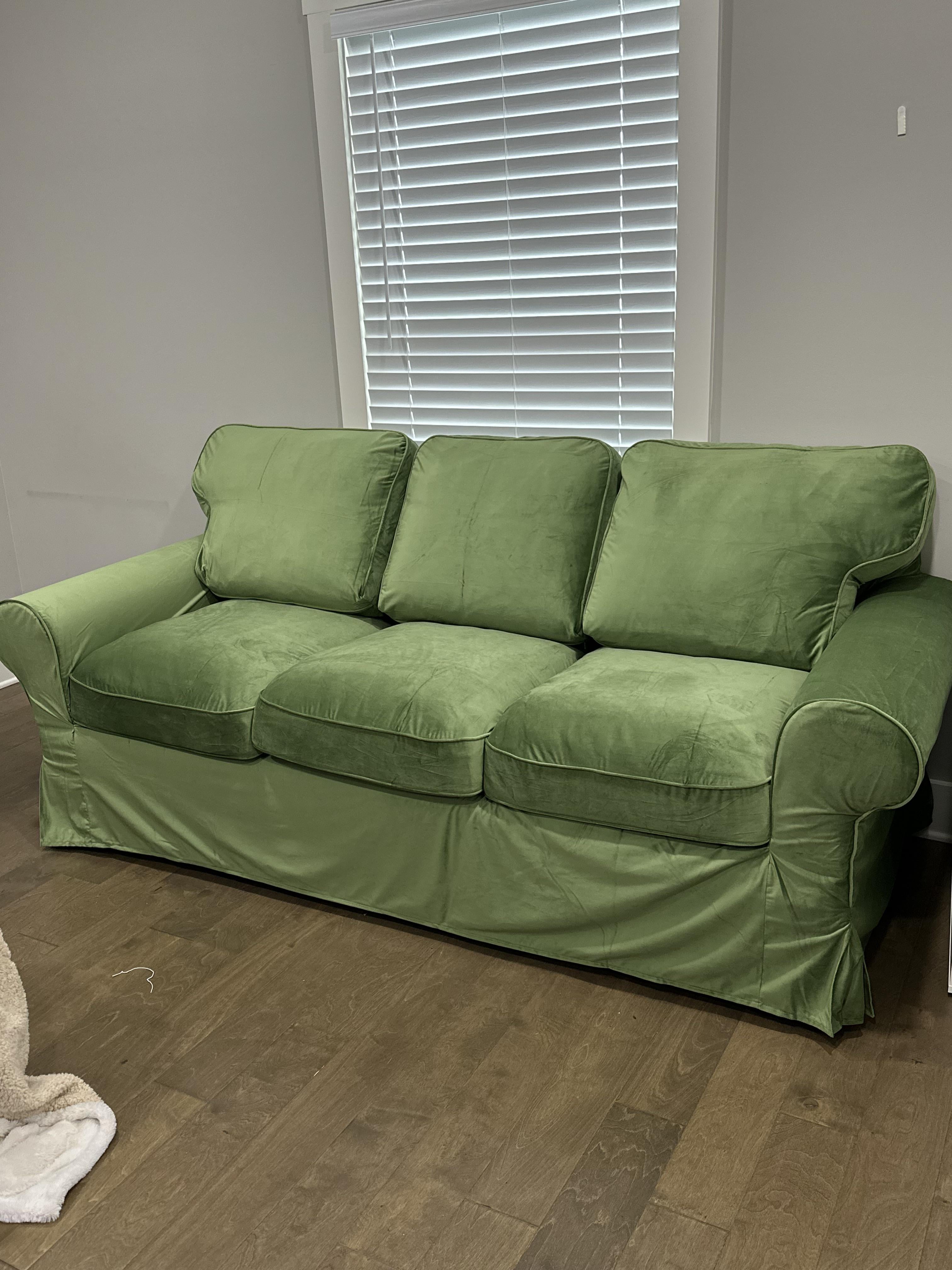 Thanks everyone for the love on the couch—it is an IKEA UPPLAND base with an after-market cover from Amazon. I took a gamble on the cover after getting the couch for a steal because the cover it came with was ripped, and it paid off! I just can’t visualize what will go with the mass of green in this big grey box 🫠