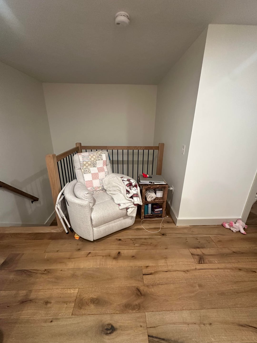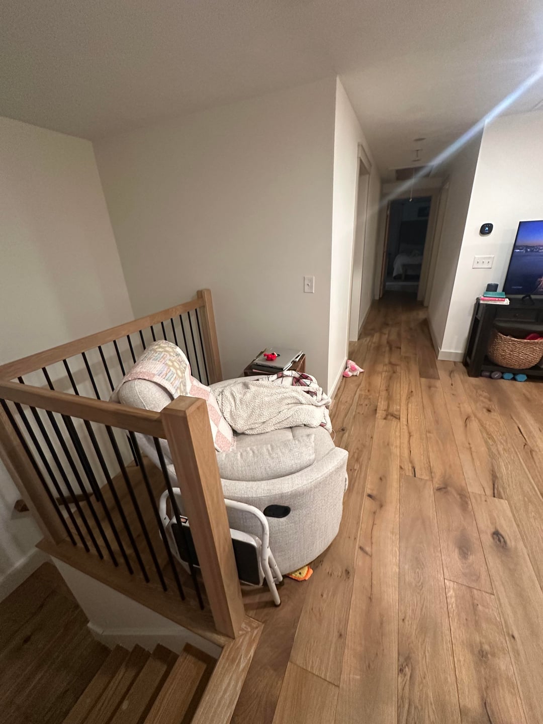 Maybe a different chair in the area by the stairs, thinking of making the a reading area with bookshelves.