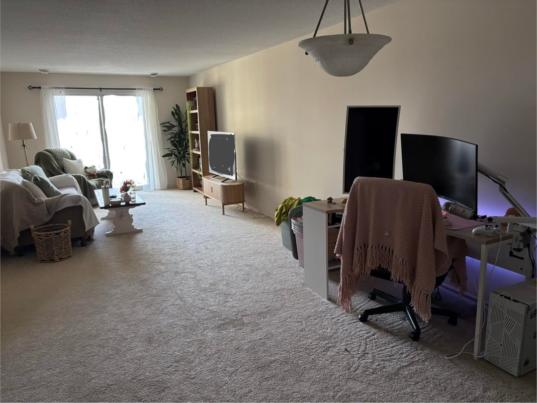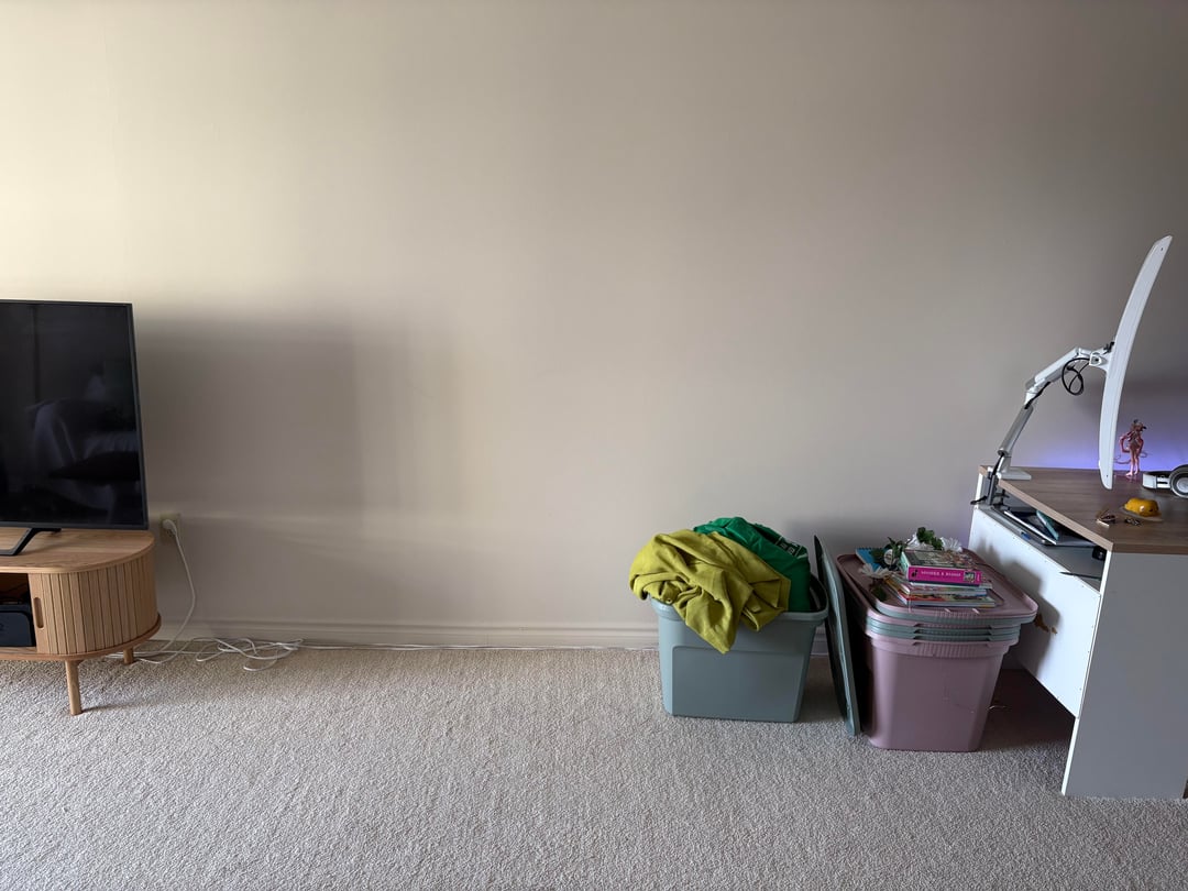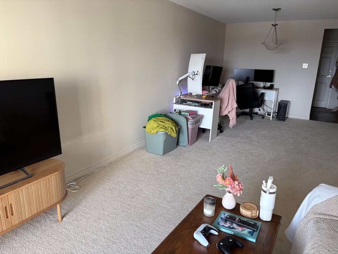 You can see it best in photo #2. It’s about 2.5 metres to 3 metres long in our one bedroom apartment. It’s this awkward gap between two busy zones in my living area. This is a rental apartment, but we live in Canada so I’m open to hanging stuff. I want the computers to stay in the living area. My bedroom needs to be a dark, quiet sanctuary:)