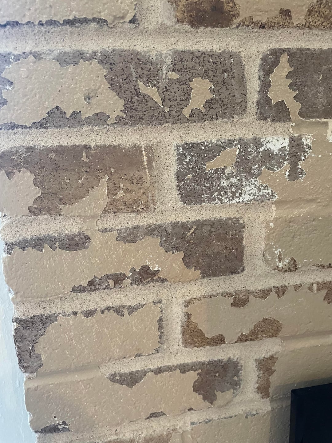 On the fireplace brick, they used the wrong paint. It’s easy to chip off so I removed some to see the brick underneath.