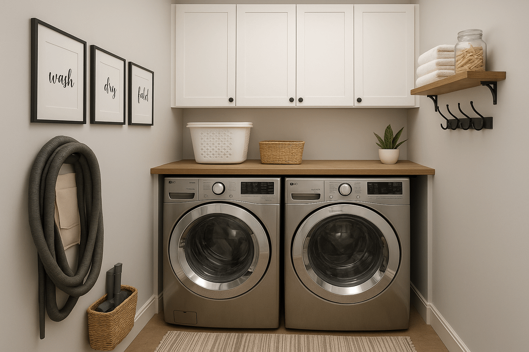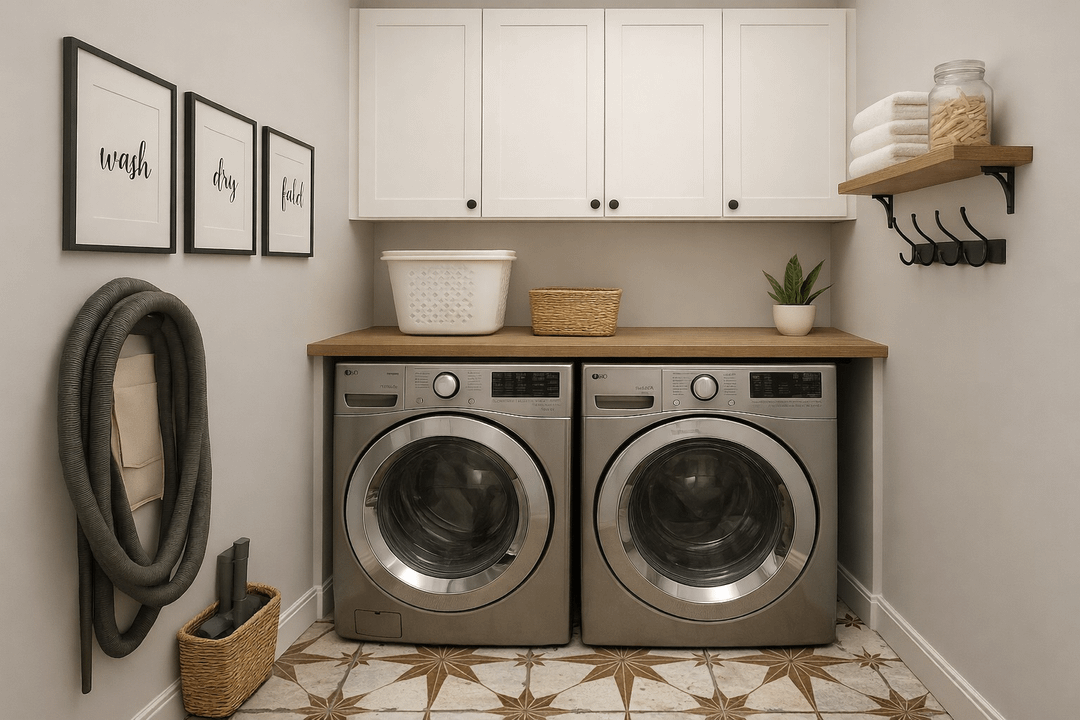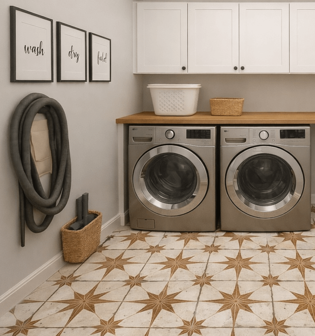 **Pics #1-4 are AI. Pic #5 is my actual laundry room. Question- I'm tiling my small laundry room(5'x9') with the above tile, then repainting, accessorizing etc., to resemble the AI mock-up. Should I hang wall paper or tile behind the washer & dryer, or will the tile floor be busy enough? If so, any ideas? Note- I'm trying to keep it simple because we might be selling.