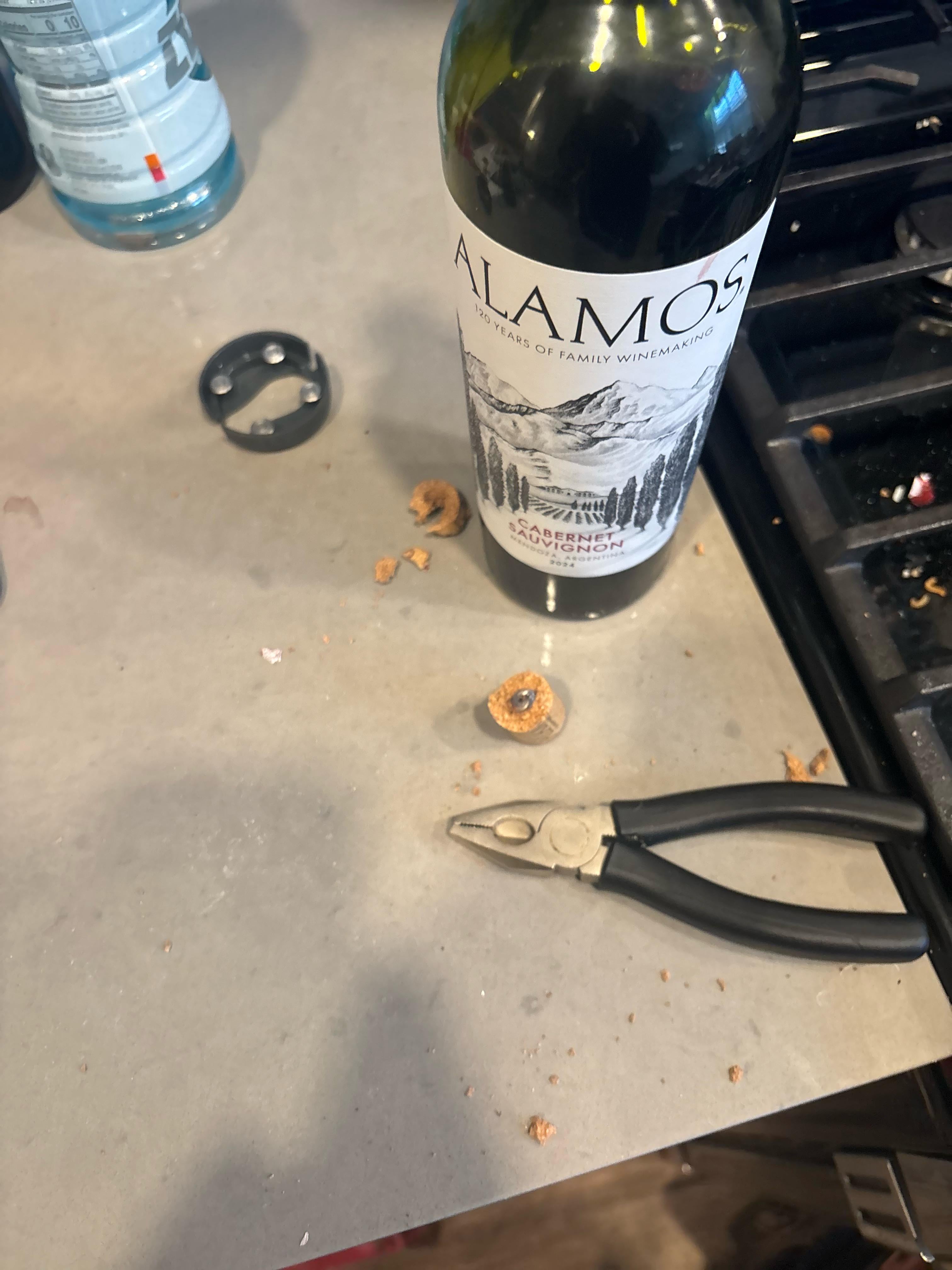Thanks for joining everyone. I ended up ordering a new corkscrew which did nothing but tear the cork up more. I ended up grabbing the metal bit with pliers and pulling, like so many of you all said. Thank you for the laughs and cheers.