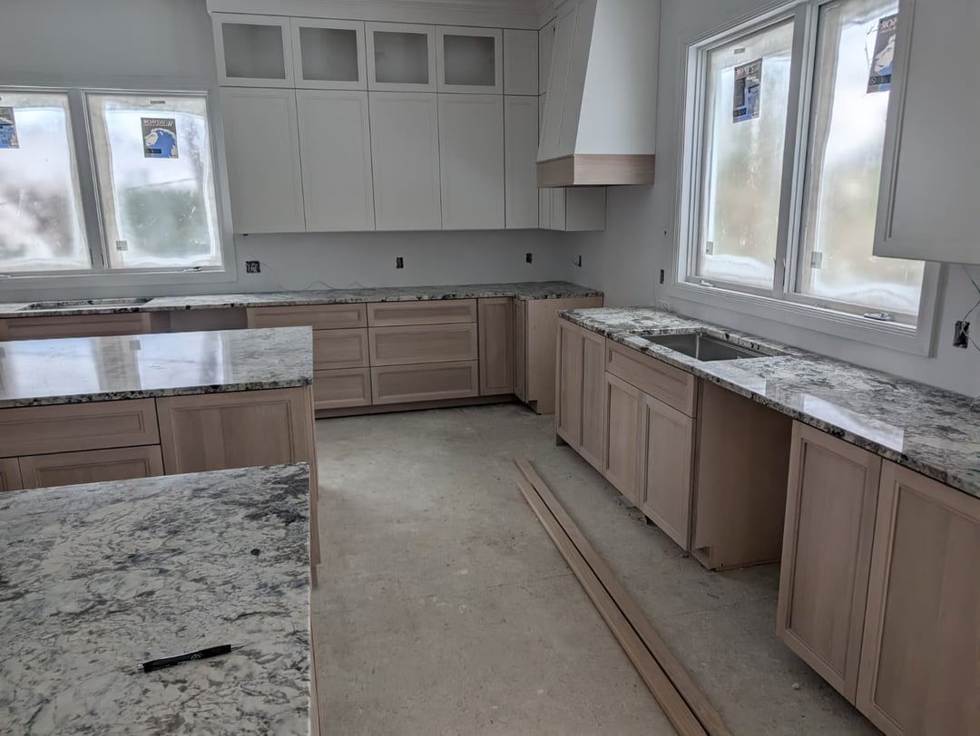 The granite as the backsplash is feeling really busy – I definitely agree with your designer here. You could go with a light tile like they recommended, but if your wife is craving something a little more bold you could consider pulling one of the tones from the granite like a dark grey and finding a tile like that. What are you guys doing for the floors? You’d be surprised how much of an impact the flooring makes and you should definitely consider how it’ll look as a full room with the flooring in. I’d also recommend putting in a dark-coloured pendant light above each of the windows to help pull in the countertop if you’re not going dark elsewhere!