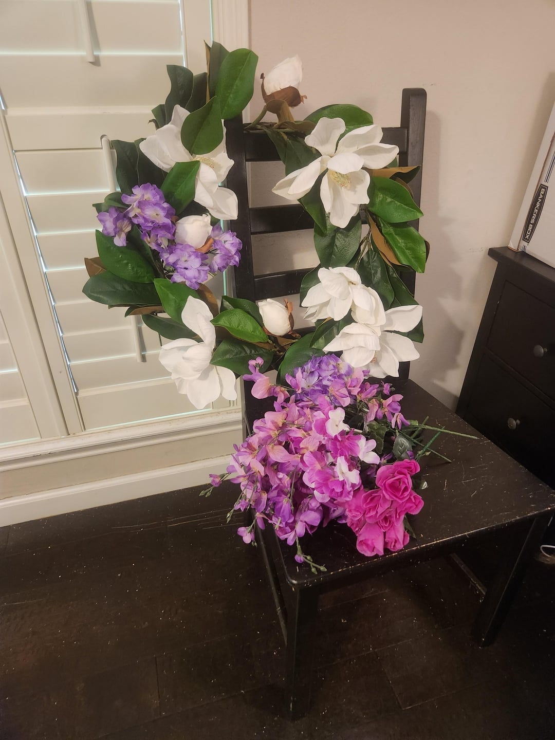 I chose different shades of Purple and having a Florist arrange flowers on my Wreath. I am on a budget and she will put together Wreath for me at a low cost.