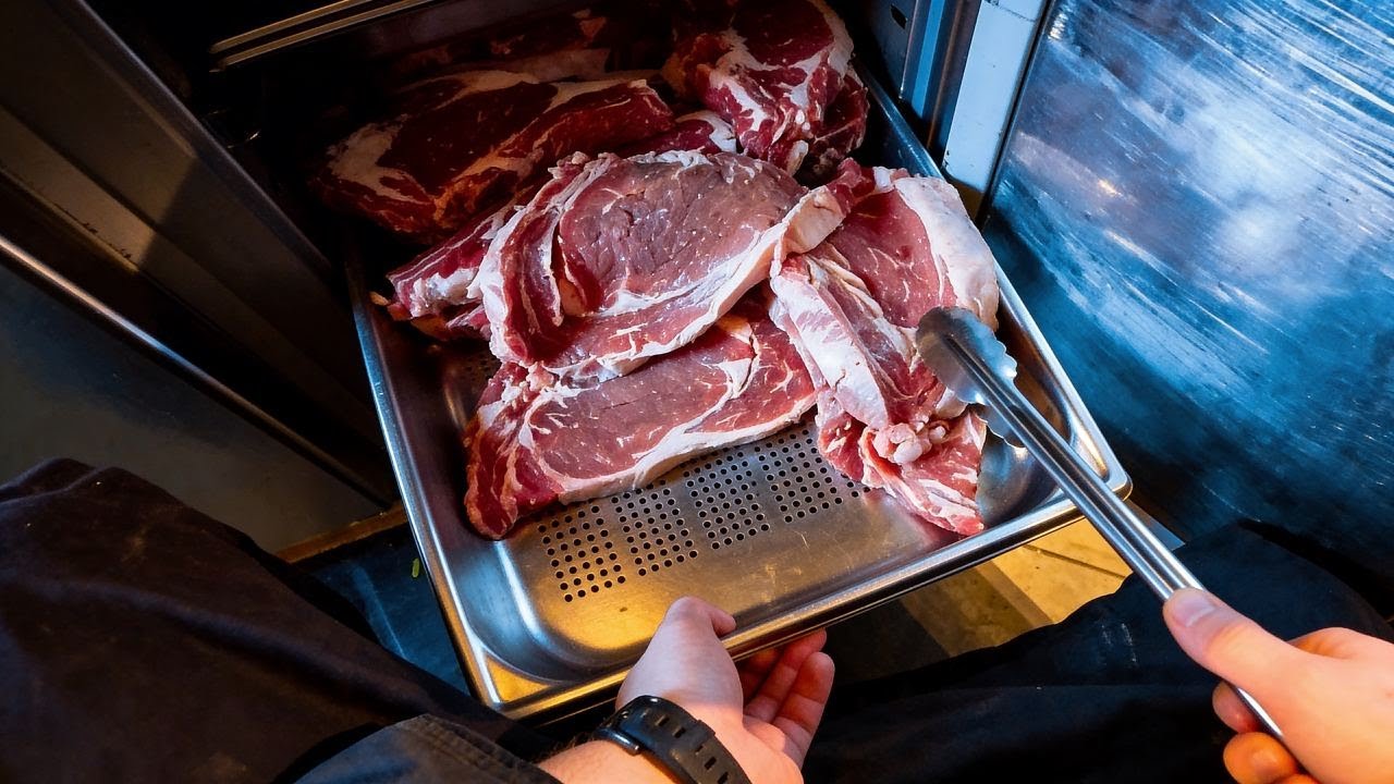 Steaks cooking on the grill, real kitchen sounds, and authentic restaurant atmosphere.