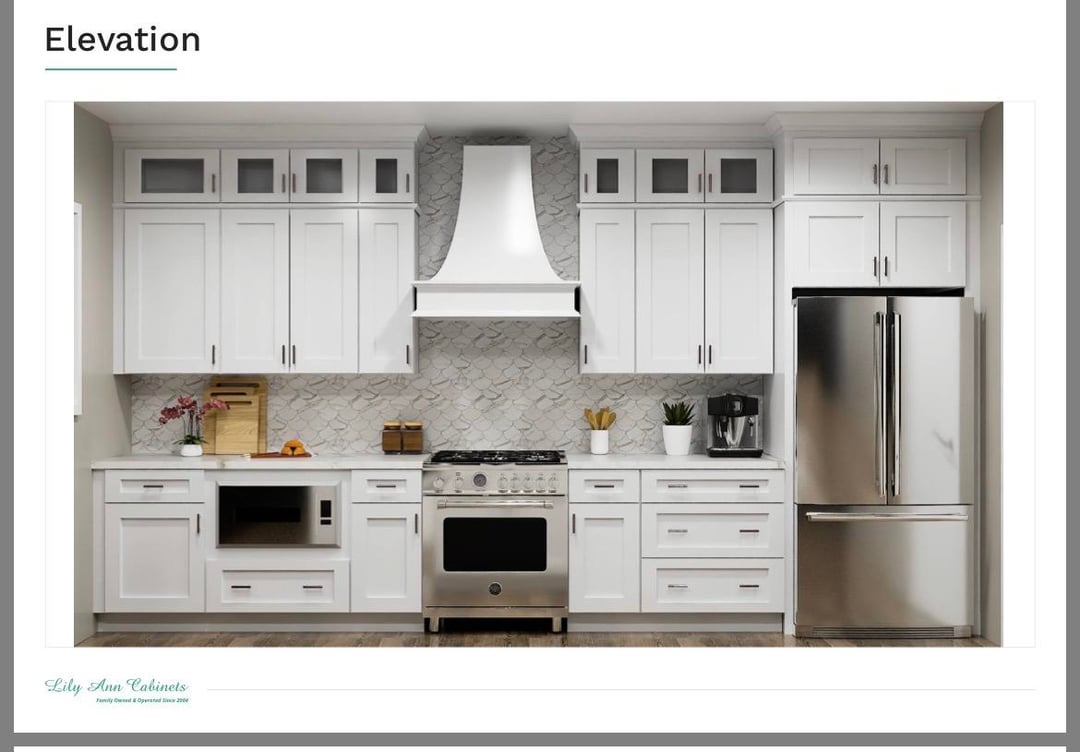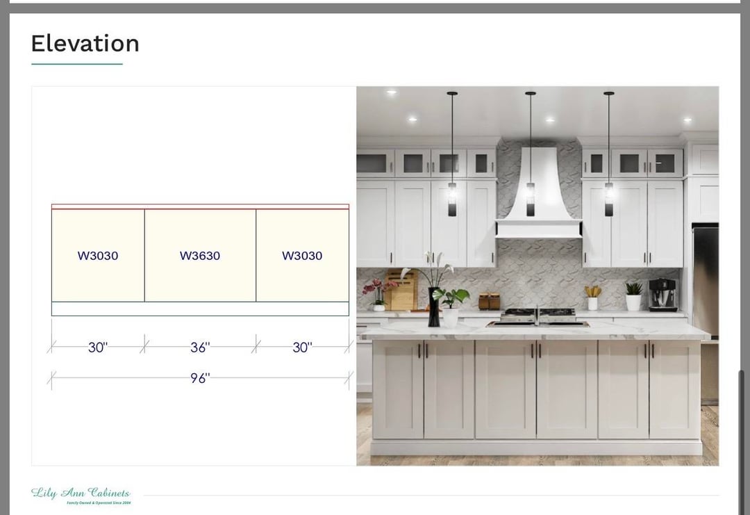 I’d consider removing the two small cabinets to the sides of the exhaust. It makes the exhaust look very crowded / boxed in. If you want to keep the cabinets, I’d use a squared off minimal exhaust. The one in the rendering is too nice not to highlight it. plus the sides are going to be hard to clean.
