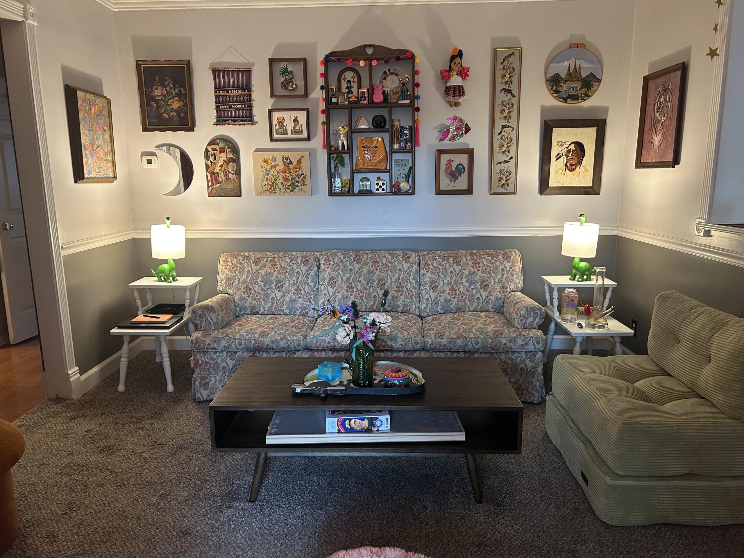 well, I know you may like the tables that’s why you have them there. but since you have an eclectic style. have you considered a different end table? and it looks like you have some beautiful hardwood floors there? have you ever considered pulling up the carpeting and exposing those beautiful floors?