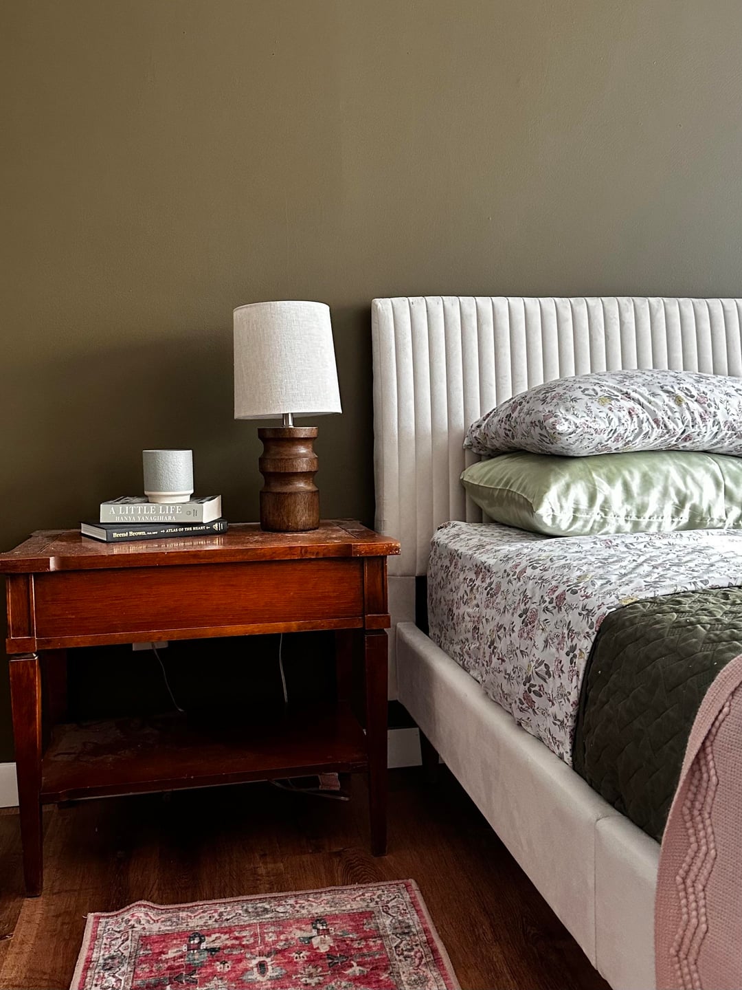 I don’t love the night stands – they’re thrifted end tables I previously used in the living room and here they’re turned sideways. I’m also looking for a white quilt instead of the green. And I kind of need some lamp / lighting inspiration.