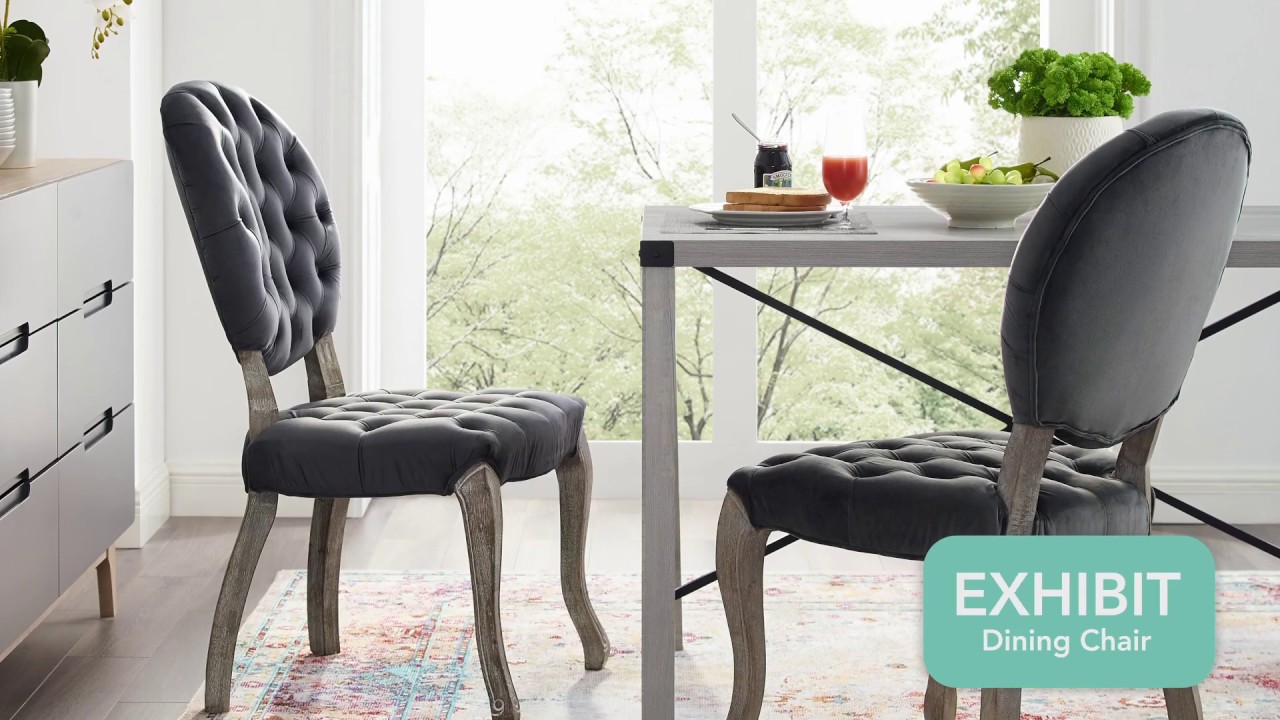 Welcome Parisian elegance with the Exhibit French Vintage Performance Velvet Dining Side Chair. Elegantly designed with deep-button tufting, a round seat back, weathered wood cabriole legs with chiseled artisan detail, Exhibit makes a beautiful addition around the dining room table, in front of a vanity, or as an accent piece in the living room. Finely upholstered in stain-resistant performance velvet.