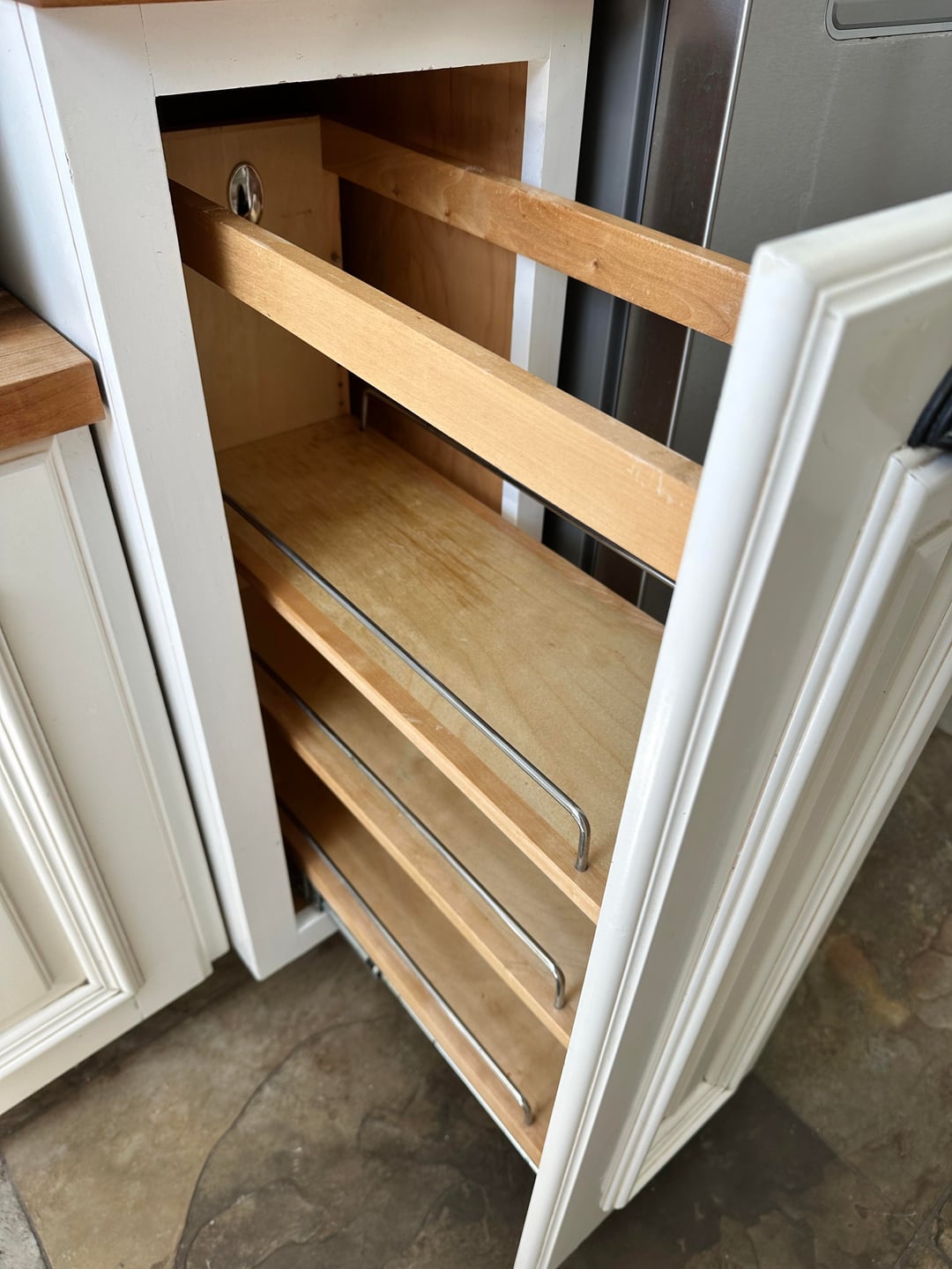 Hey everyone! I just moved into a new place and I am trying to figure out how to make the most of this narrow pull-out cabinet in my kitchen.