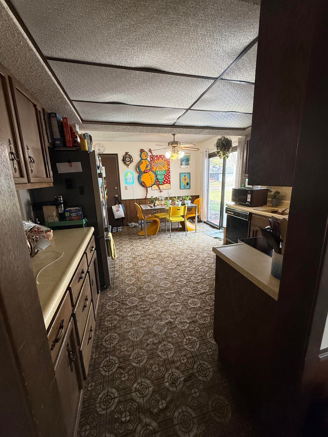 This is our kitchen. I inherited a home and my dad never updated. Which I’m glad for. I want the house to keep its character, 70’s tri-level. The carpeted floor is coming out and the walls will be painted. My biggest issue is food storage and I’m open to ideas re:flooring and paint. The furniture and art our ours and they will be staying. What would you do?