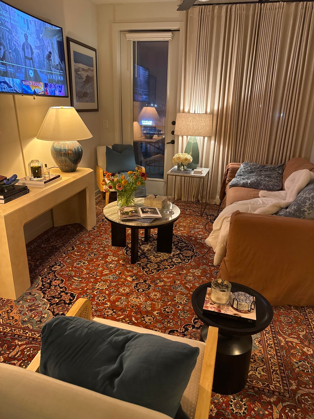 I love the rug but I gravitate to maximalism. I think the space would be pretty bland without it. I’d try to hang the TV lower and perhaps replace the console below it with a more traditional style cabinet or sideboard.