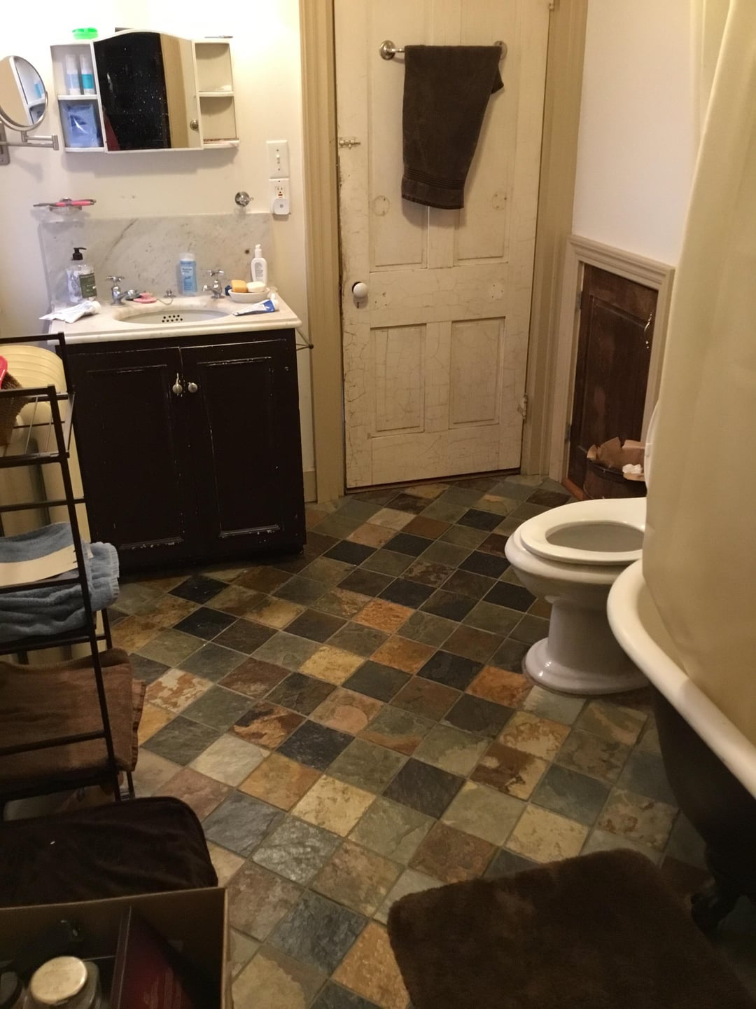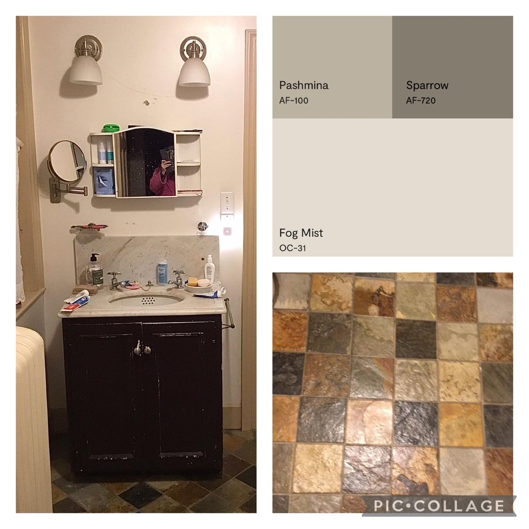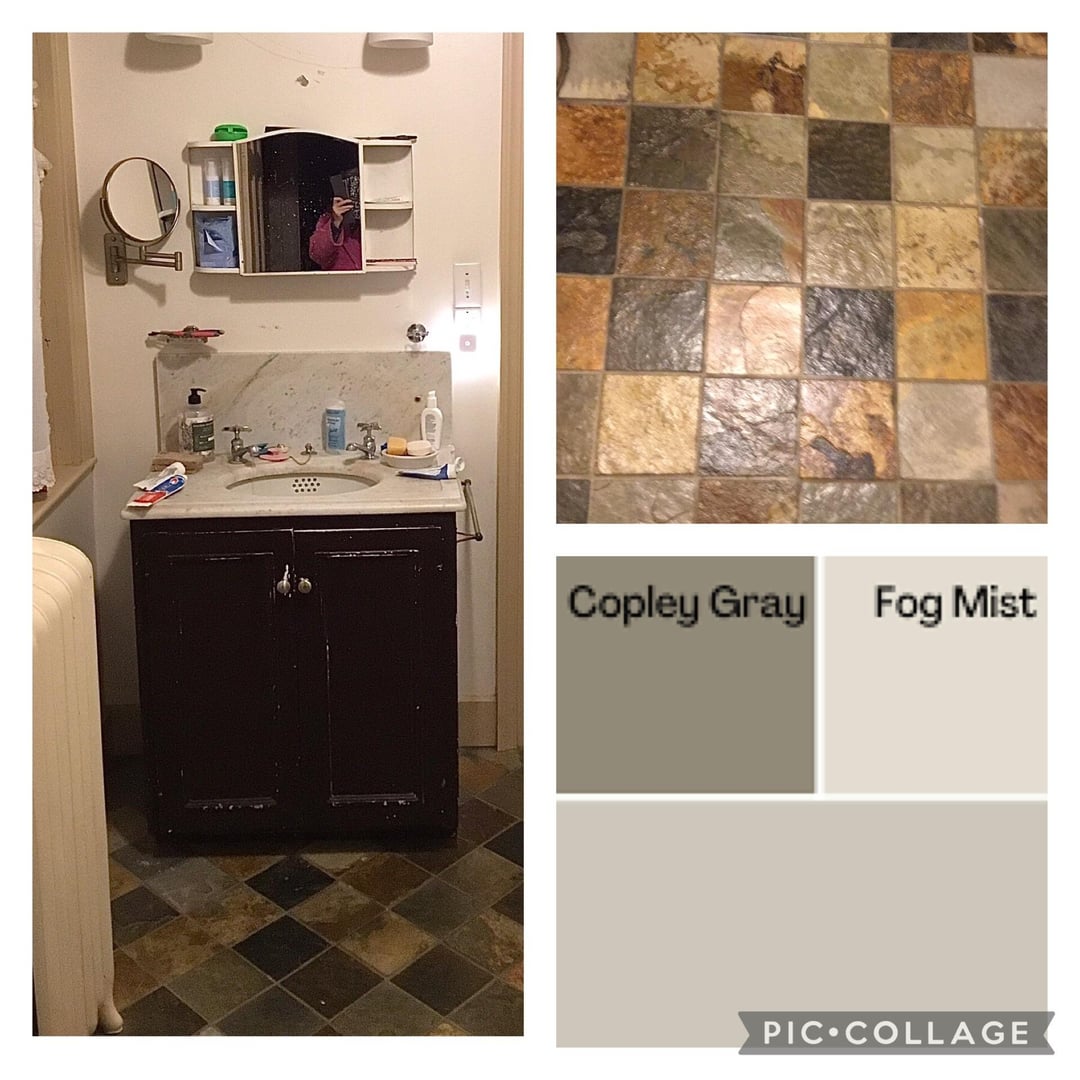 I’m not replacing a thing except the mirror and curtain. Trying to work with slate floor…Copley gray or sparrow (vanity, bottom of the clawfoot tub). Pashmina trim and fog mist walls, maybe but there’s a lot to consider including a medicine cabinet, 2 doors, a crawl-in closet as well as a radiator. Im really confused about what color to put where!