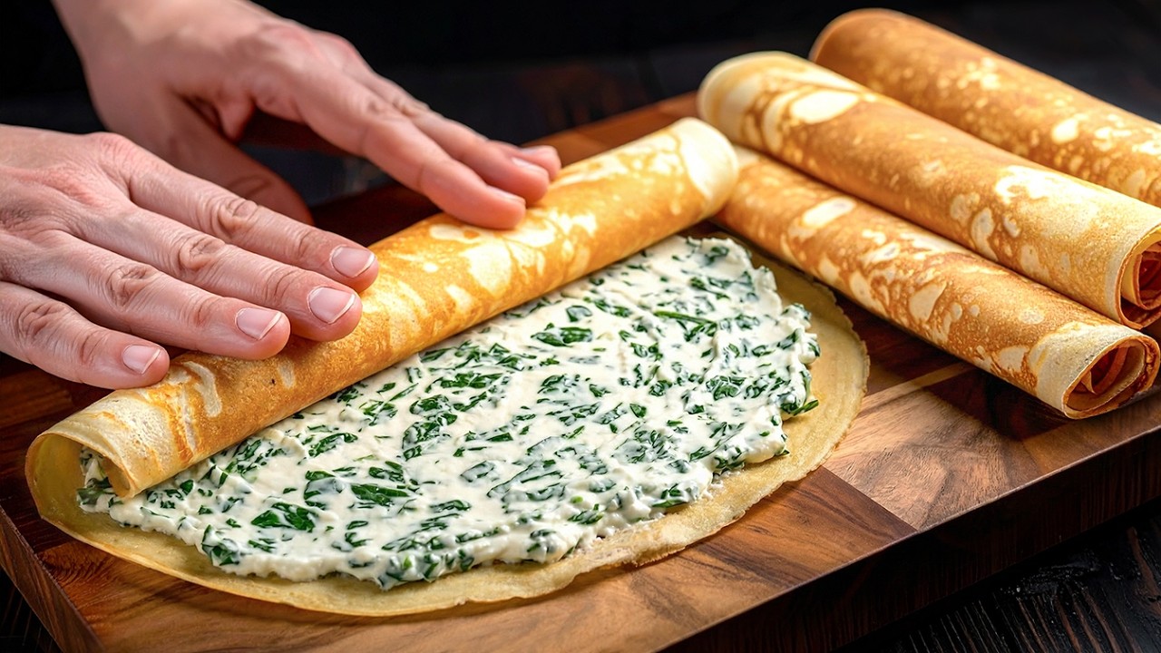 Hallo Freunde! Erstaunliche Crêpes mit Füllung meiner Oma in 10 Minuten. Ein schnelles und einfaches Rezept für die leckersten französischen Pfannkuchen. Spinat und Käse verleihen diesem Gericht einen einzigartigen Geschmack. Dieses leckere und schnelle Rezept kennt keiner. Sie wissen nicht, wie Sie etwas Leckeres zum Mittag- oder Abendessen kochen sollen? Das beste Pfannkuchenrezept für dich. Guten Appetit!