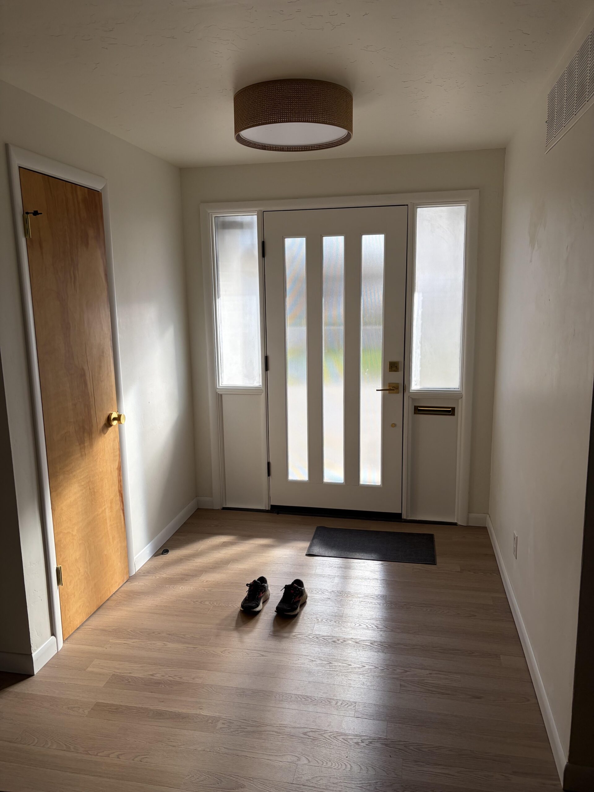 Get a console table or a slim show rack (ikea has a popular one) and hang a mirror above it. Get a large entryway rug too.
