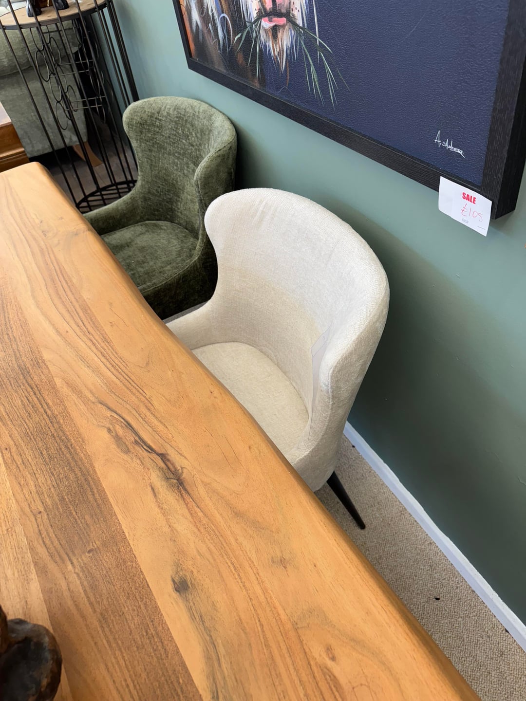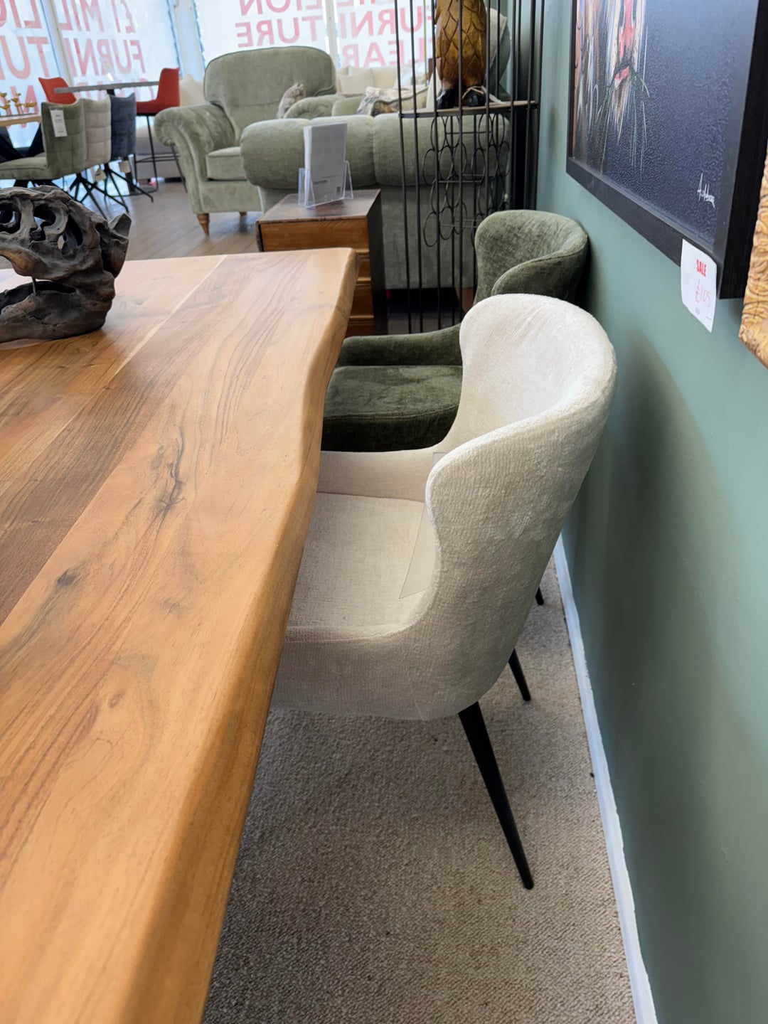 For the dining table: a light to medium natural wood in a warm tone (oak, beech, ash) will connect the floor and the cream in a way that feels cohesive rather than accidental. A simple silhouette lets the chairs carry some visual weight. If you want to contrast the floor more, a painted table in off-white or soft warm sage could work beautifully with cream chairs and lift the eye up from the floor.