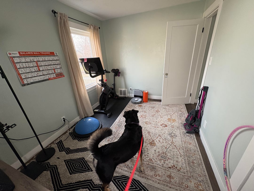 Could you put a small loveseat where the blue bouncy thing is? If you downsized the tv console to a small one it could break the room into two parts with separate spaces for exercise and lounging.