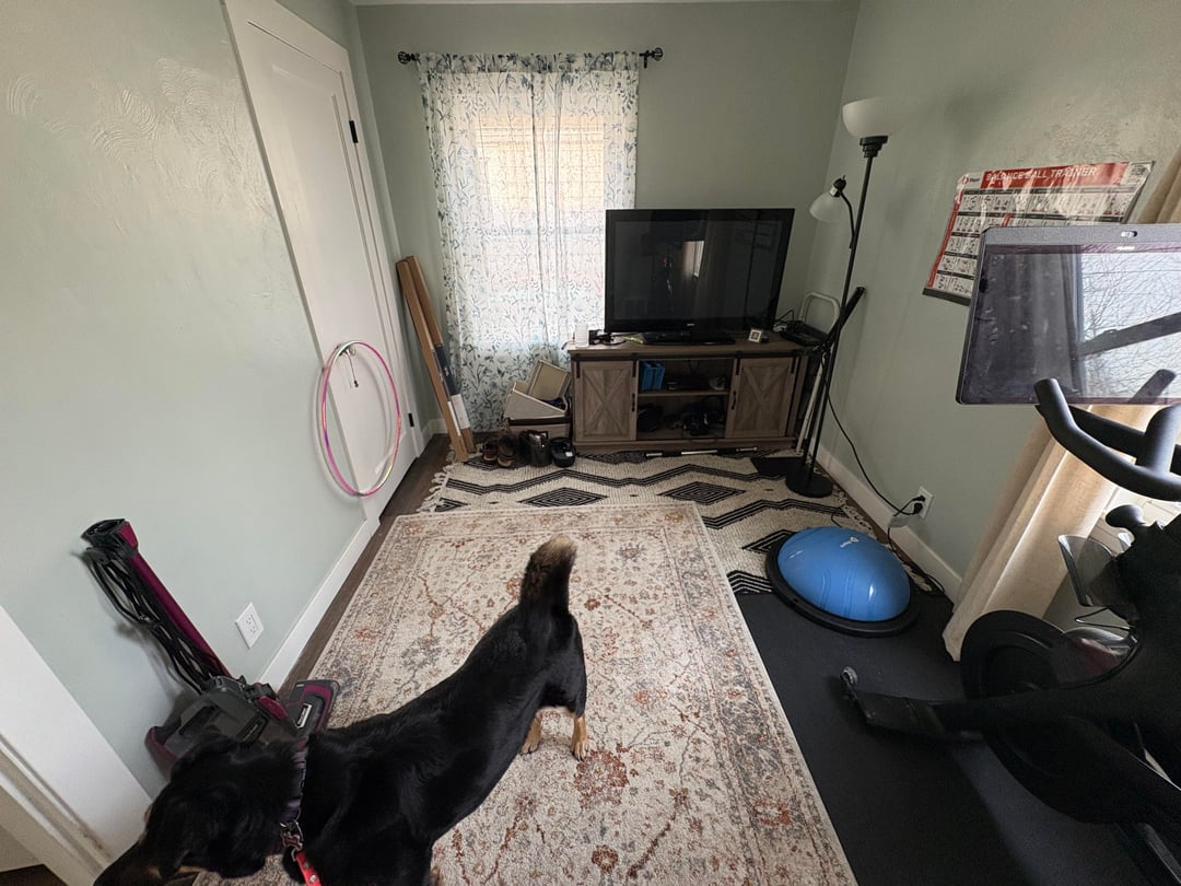 Ideally, I’d love to fit my Peloton, a loveseat, and a yoga mat but the door placements are tricky. If you have an eye for small-space dimensions, I’d love your input on which sofa size works best and how to swap the gray/black/white vibe for something much more colorful. Also looking for a more streamlined TV console recommendation!