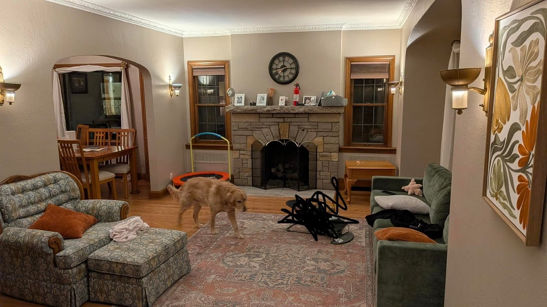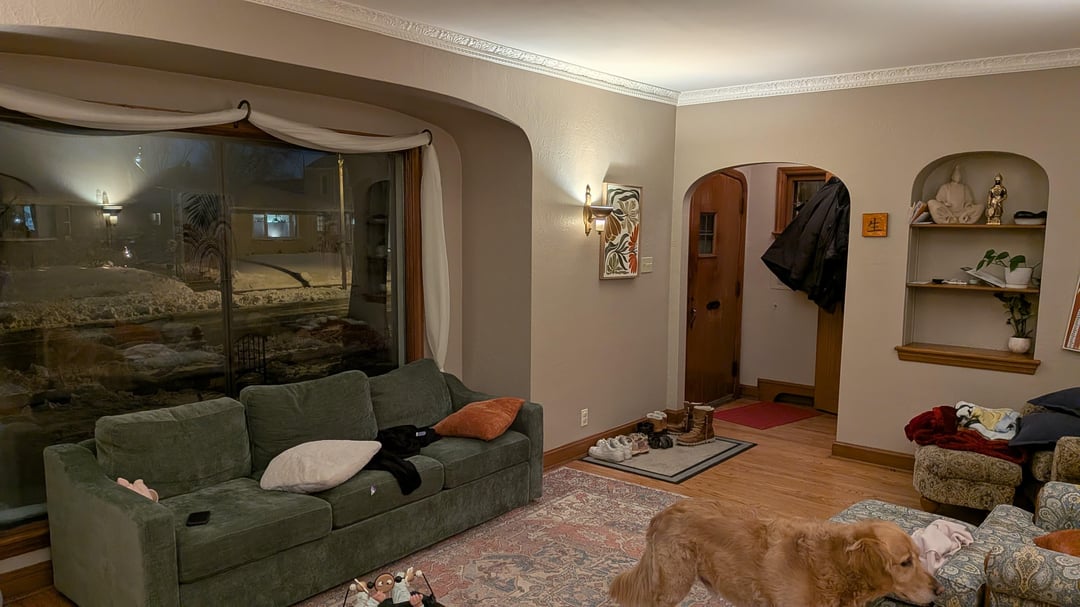 Coffee table swap: replacing a glass or hard-edge table with a large upholstered ottoman is one of the best moves for this age. Soft edges, no injury risk, surface doubles as a footrest or extra seating. A large tray on top gives you a stable spot for drinks and remotes.