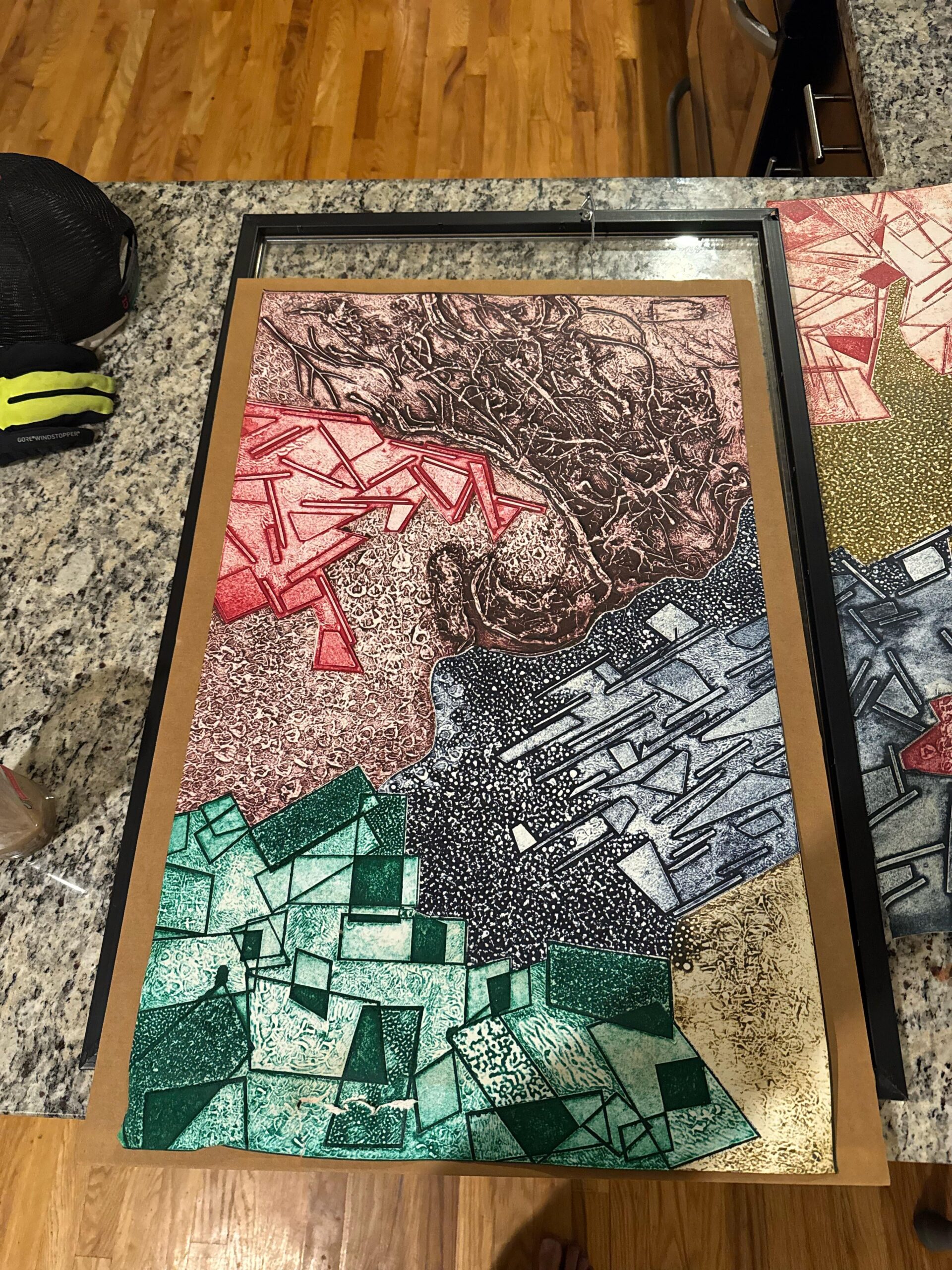 Try to tuck the tear pieces with no paint behind and the painted ones to the front. Then use a piece of acid free paper and glue to the back with a gentle glue. Then mat and frame.