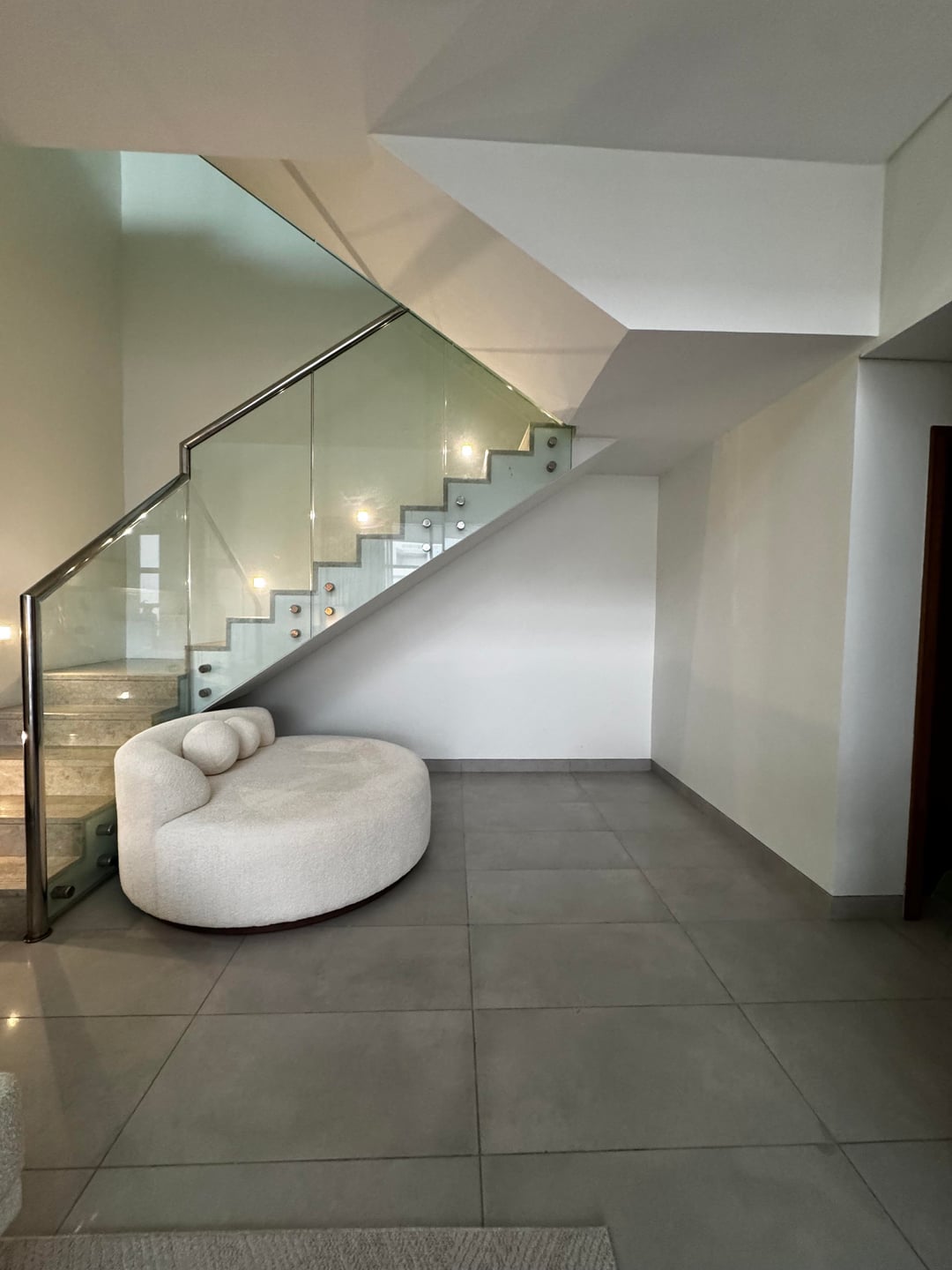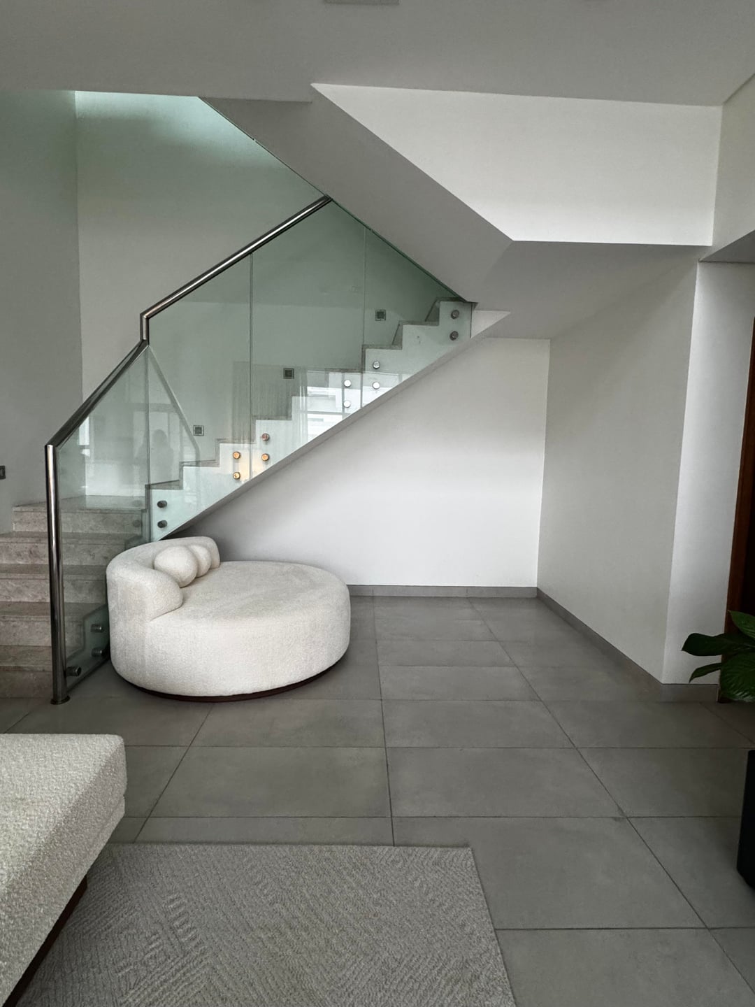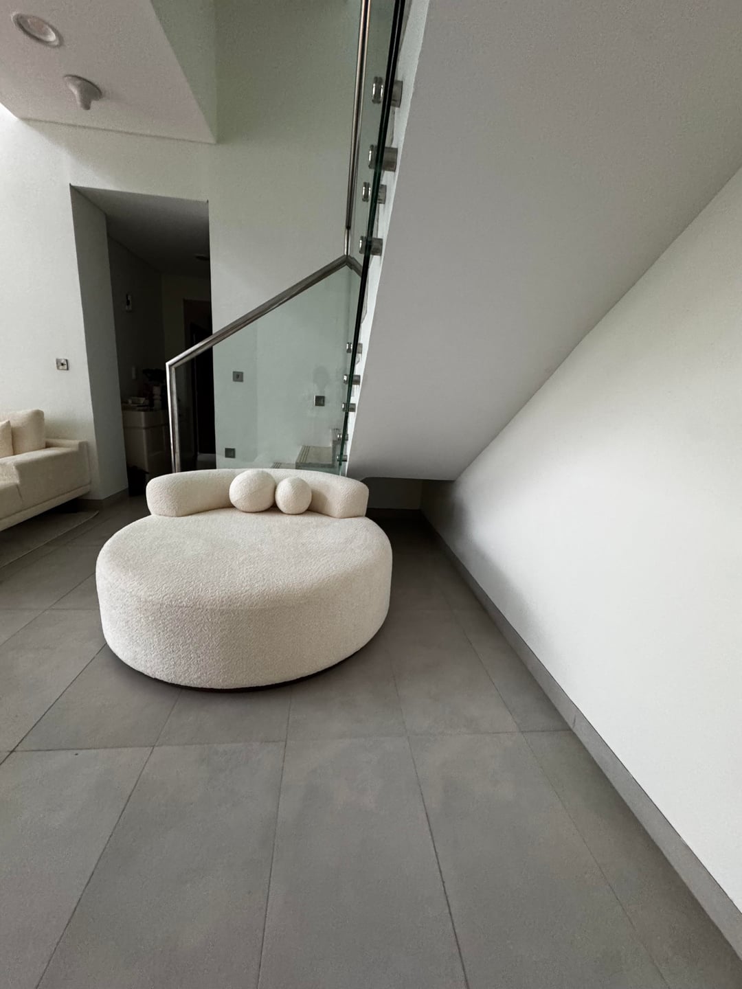 Right now it’s just empty and awkward, but I feel like it has so much potential. The architecture is quite modern and I recently added this curved boucle daybed which I love. It is part of my living room that is also styled in off white boucle and natural wood.