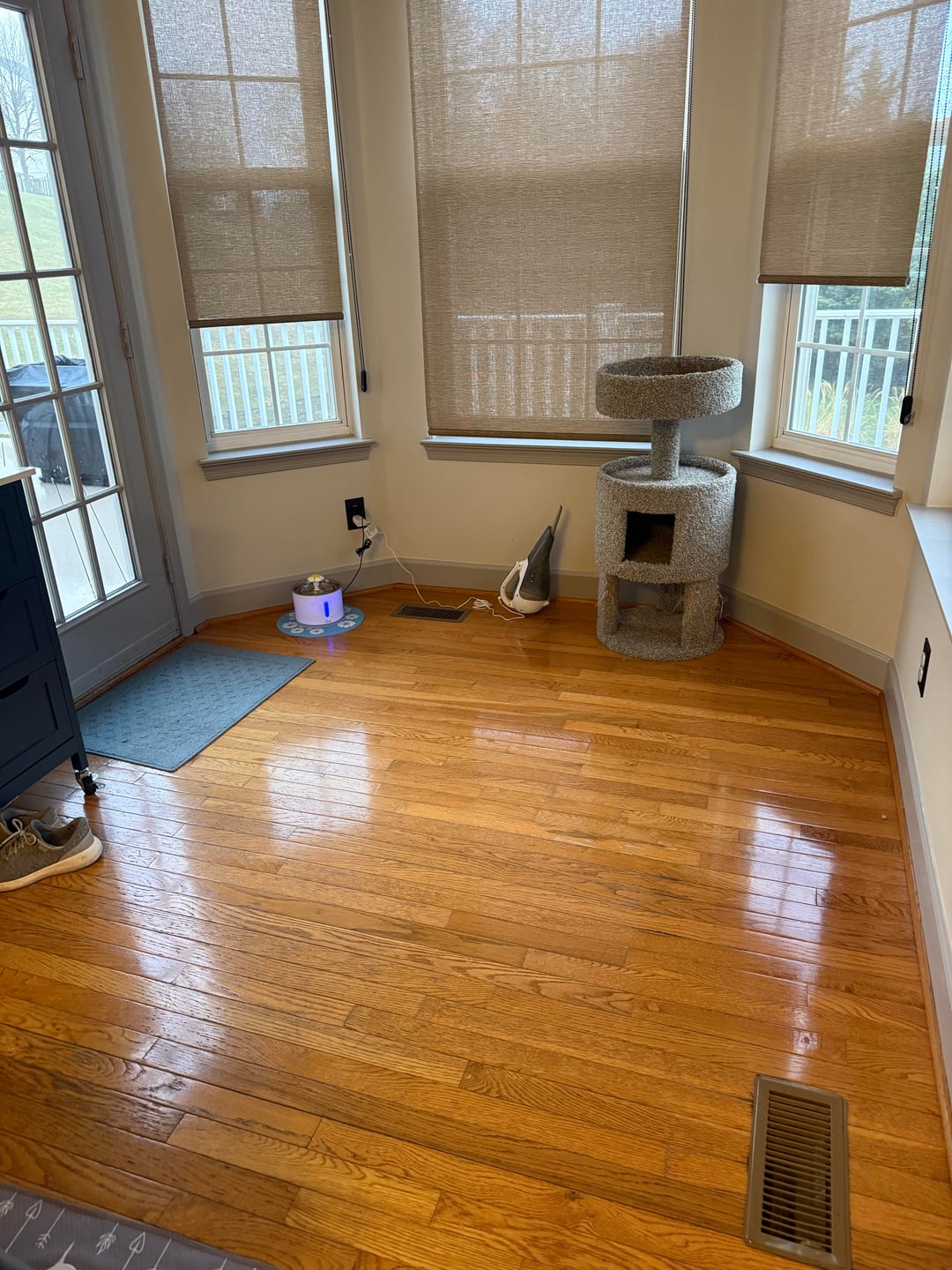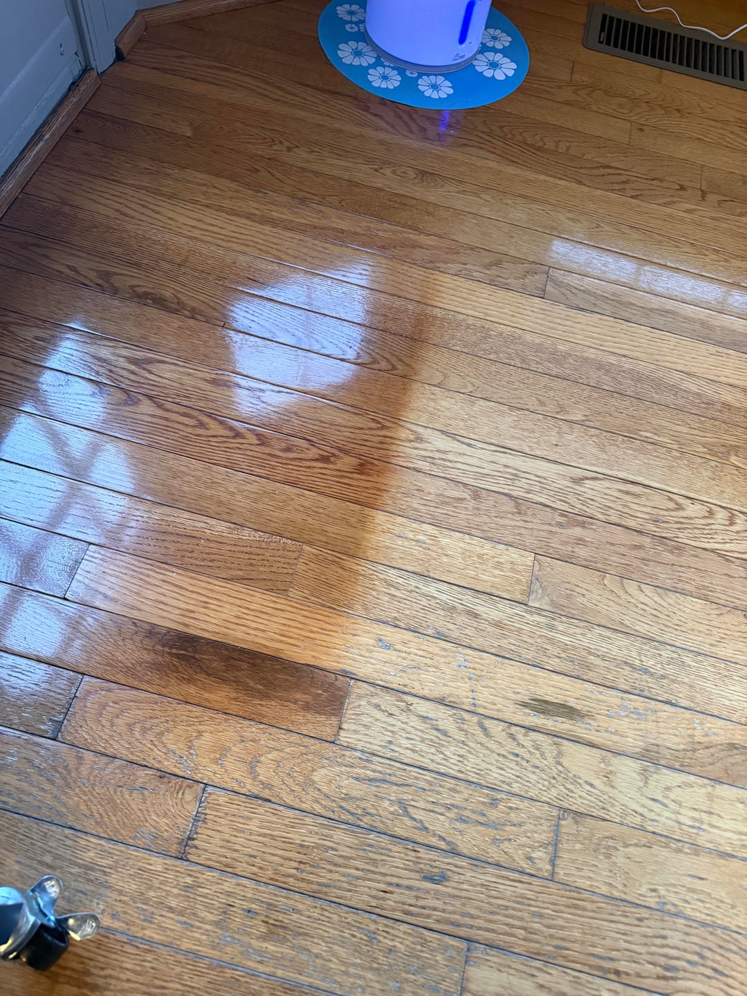 Been in this house a little over a year. The previous owner put down a large area rug in this spot and now I know why. The sun comes through here and is discoloring the floor. I’d like to add a large area rug to prevent further damage. Would round or rectangular be better? The discoloration isn’t so obvious until I move my small entry rug. Open to other suggestions too.