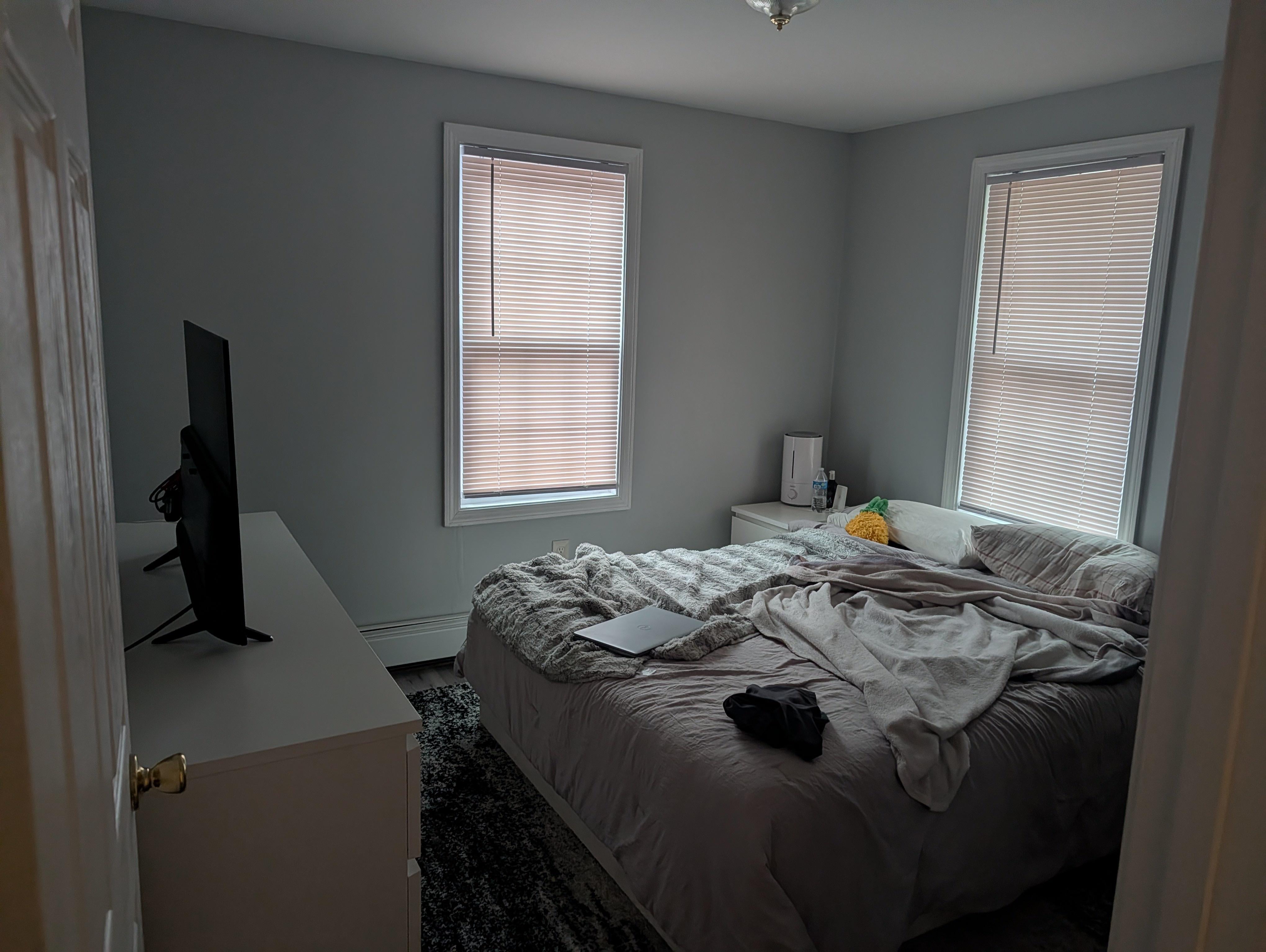 We just bought a house and I'm having trouble figuring out the layout. If we put the bed where the dresser is, we won't have enough room for night stands on each side because of the door. We also haven't gotten a bed frame yet, I'm going with a low profile one, but I just can't see how it would fit anywhere but under the window.