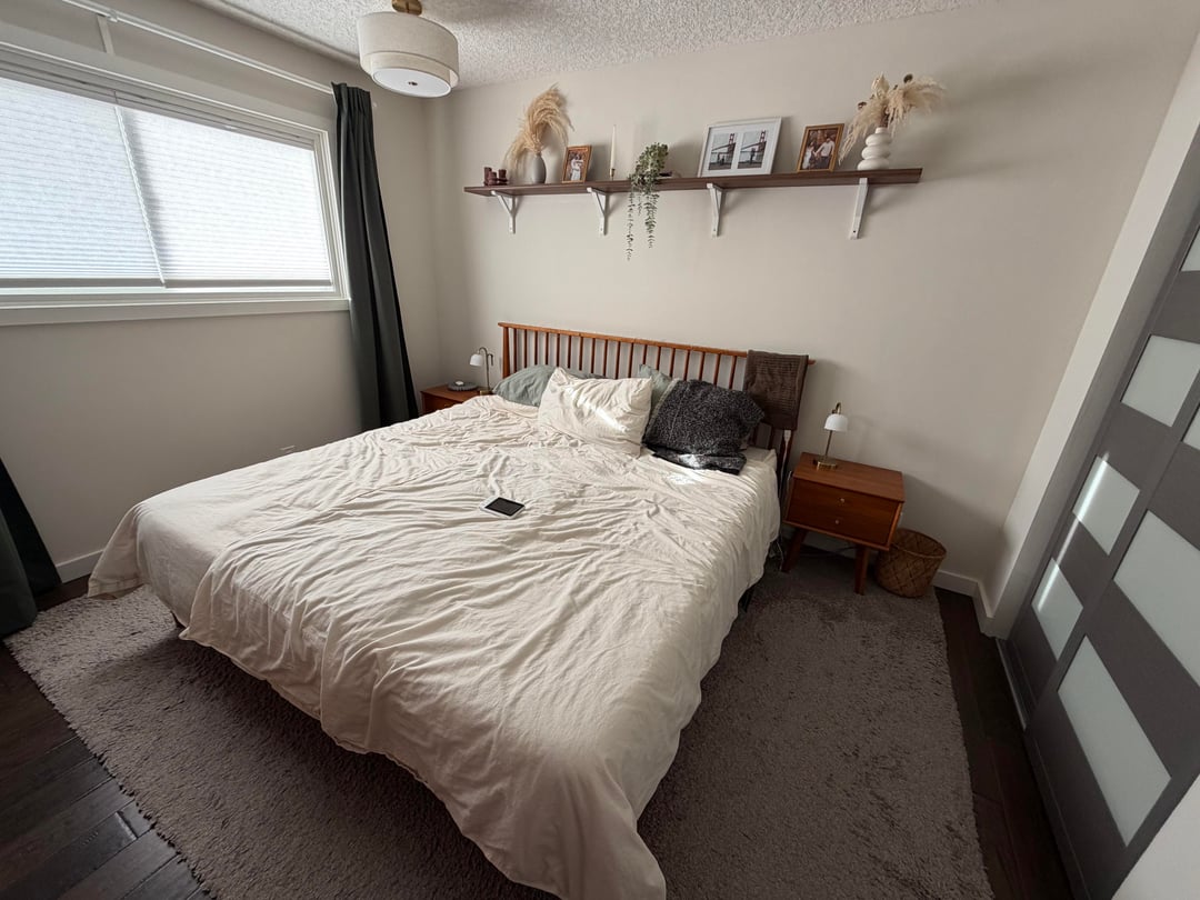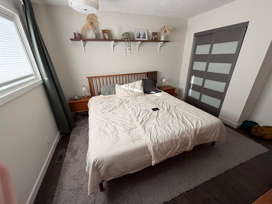 Headboard under the window. Remove weirdly high shelf. Add art. Introduce texture to bedding using different fabrics. Rug that doesn’t blend in with the floor.