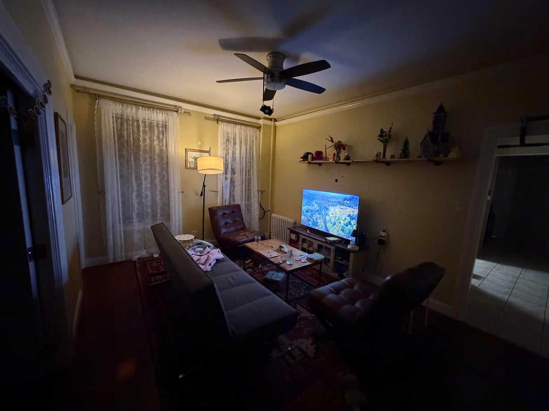 This is an annoying living room that I’ve hated my whole life. Used to be my cousin’s apartment and I inherited some elements that I don’t really like but it’s not a priority to change (ugly dark flooring, weird molding, strange double doors) right now.