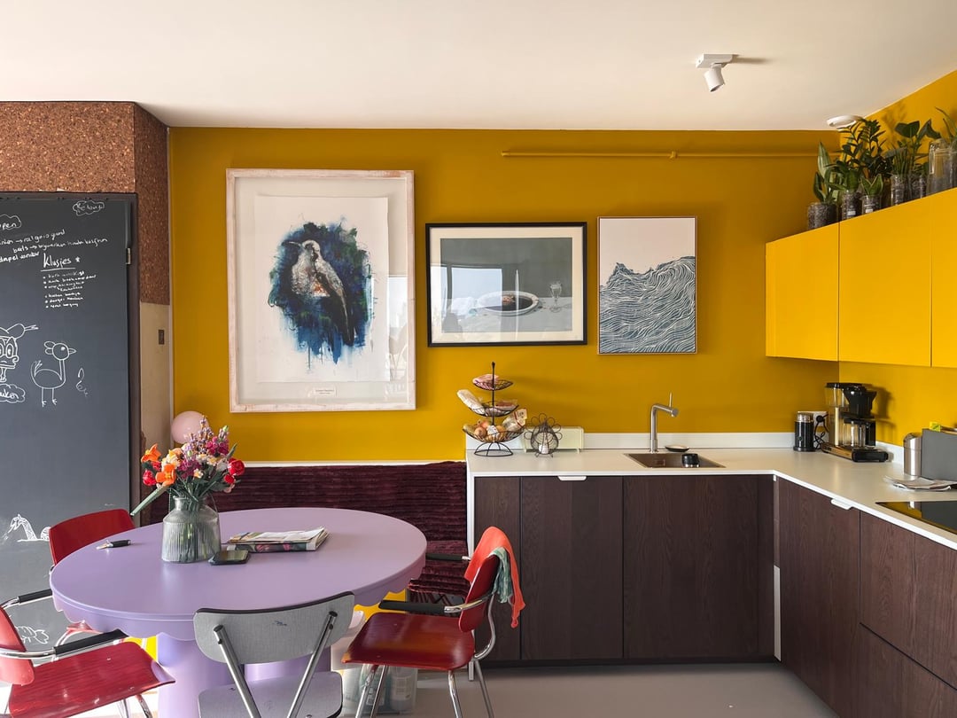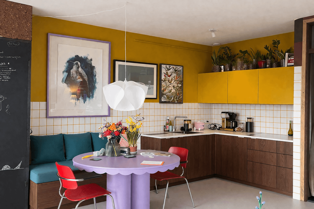 Would a half tiled wall like this work? (with adjustments on the 'art') Good to know its in an 'open' livingroom-kitchen combo. And i like funky and colourful, just wanted to get a bit more funky on the kitchen which is not yet what i like. Also i'm not concerned about reselling value etc. I'm decorating this home because I want to live in a nice home that I like 🙂
