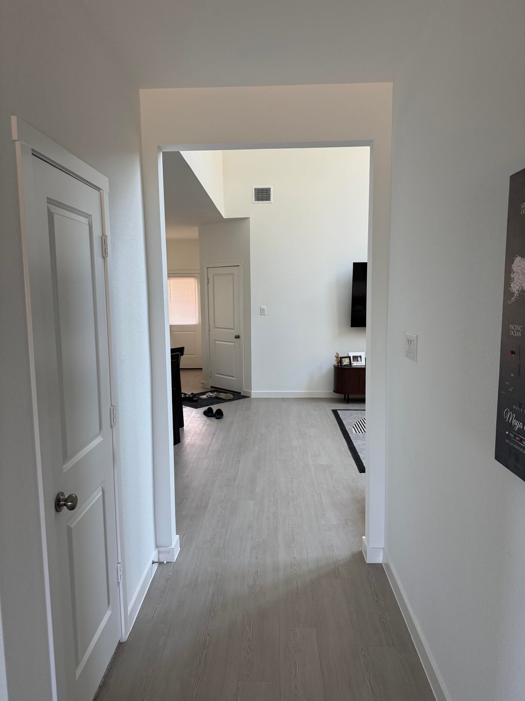My back garage door is awkwardly slanted and opens into my living room. I’ve really been stuck on how to make a functional yet not too out of place drop zone between the door and tv.
