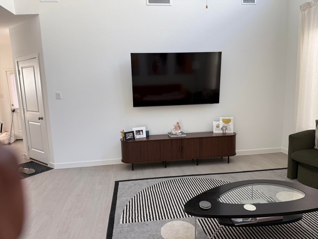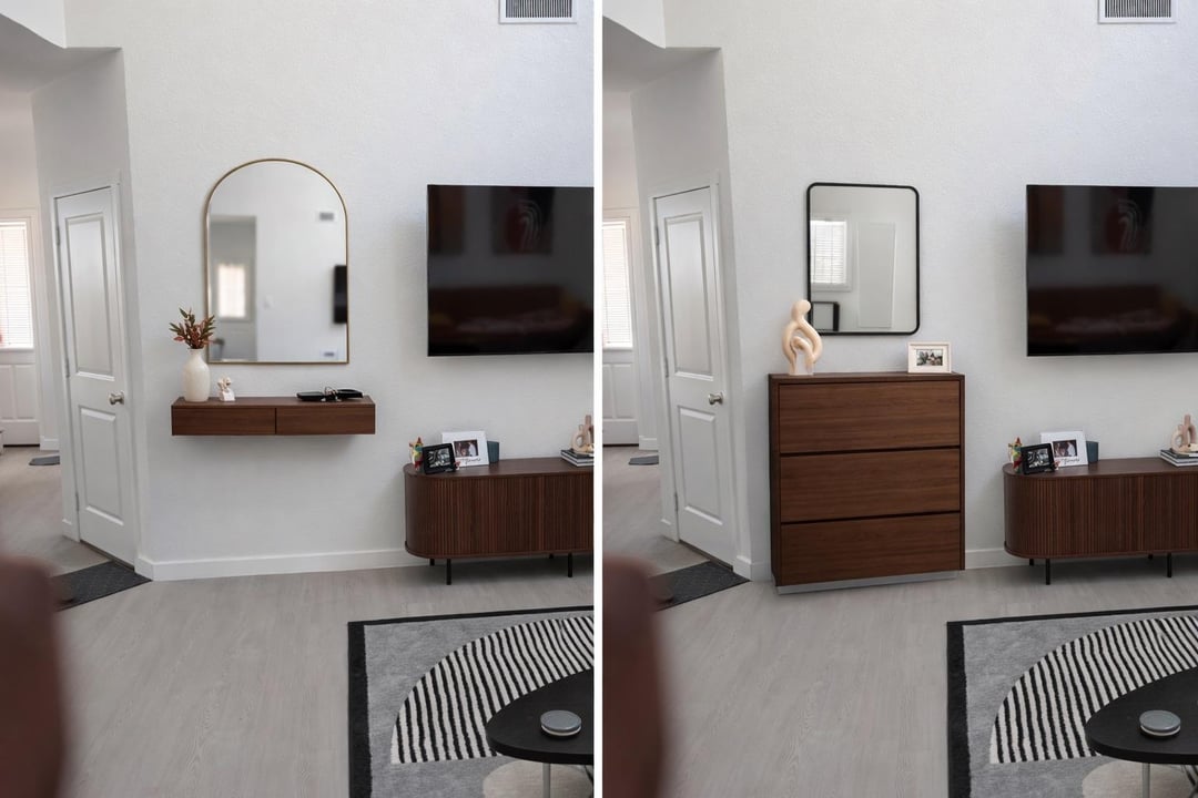 I thought of a floating shelf with a mirror or shoe cabinet with a mirror or art but idk it that looks out of place next to the tv stand (mocked up in 3rd pic).