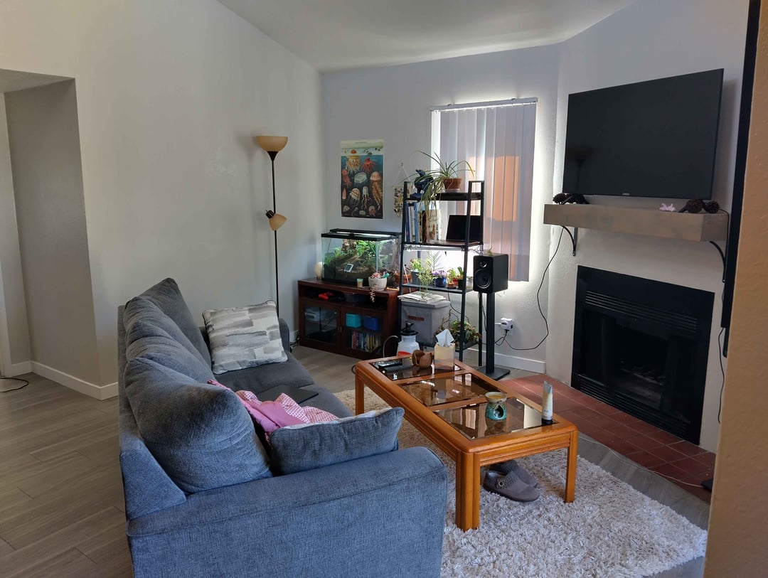 I am dissatisfied with the current layout of my living room because of the high TV, but I am not sure where else to put it while maintaining easy access around the couch and seating near the fireplace. Could I have some advice on possible layouts?