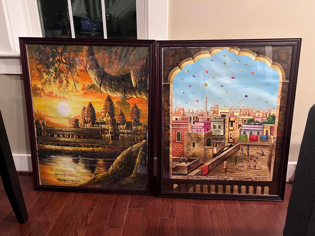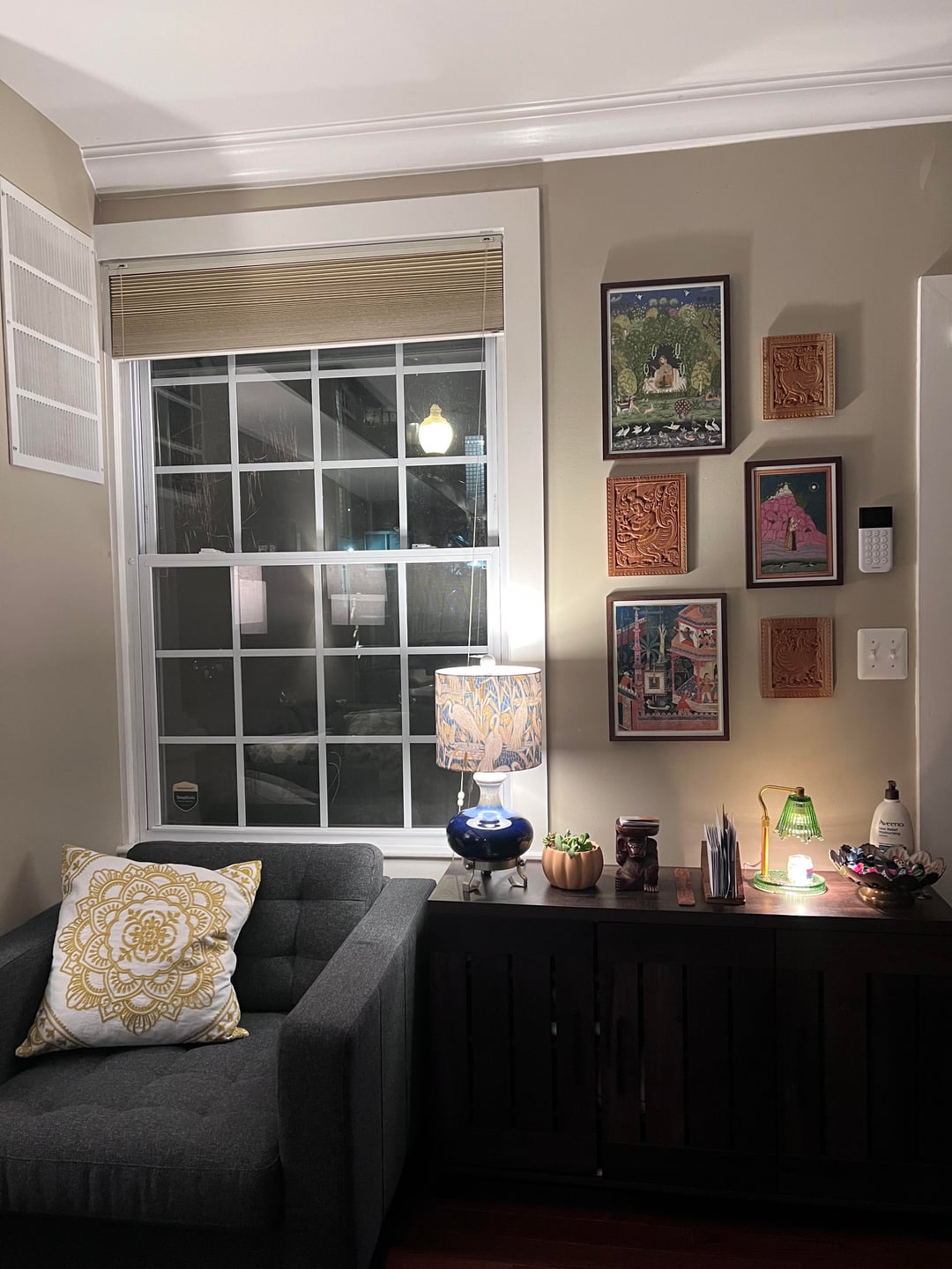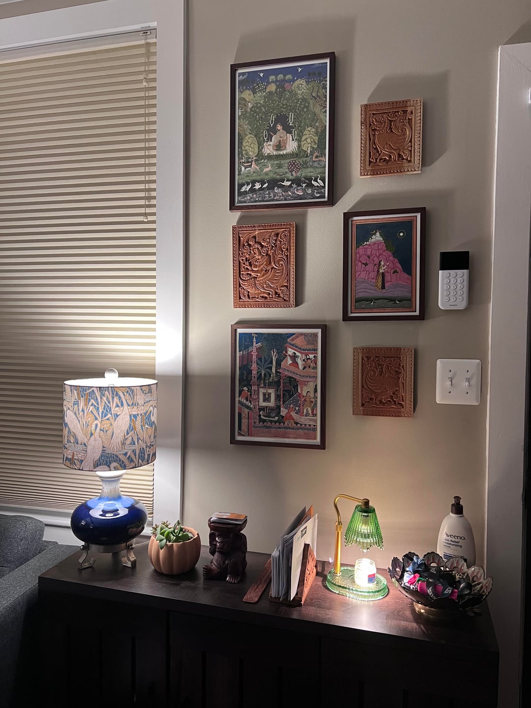 I apologize that I’m only posting small parts of the room, because the living area is quite messy and we have plans to organize more in the next couple weeks. The large paintings will be hung over the sofa soon. I bought and found a lot of decor that I liked, in colors I liked, over the past year, without really considering the colors in the big art pieces (it was easy to forget because it’s taken us so long to put them up). Every accent color in the room repeats at least once (one main shade of green, pink, yellow, multiple shades of blue that each repeat) but I’m realizing there’s no predominating color – just a lot of different colors splashed here and there. I definitely didn’t follow the 60-30-10 rule. I would appreciate any thoughts. I can also repost this once the place comes together more.