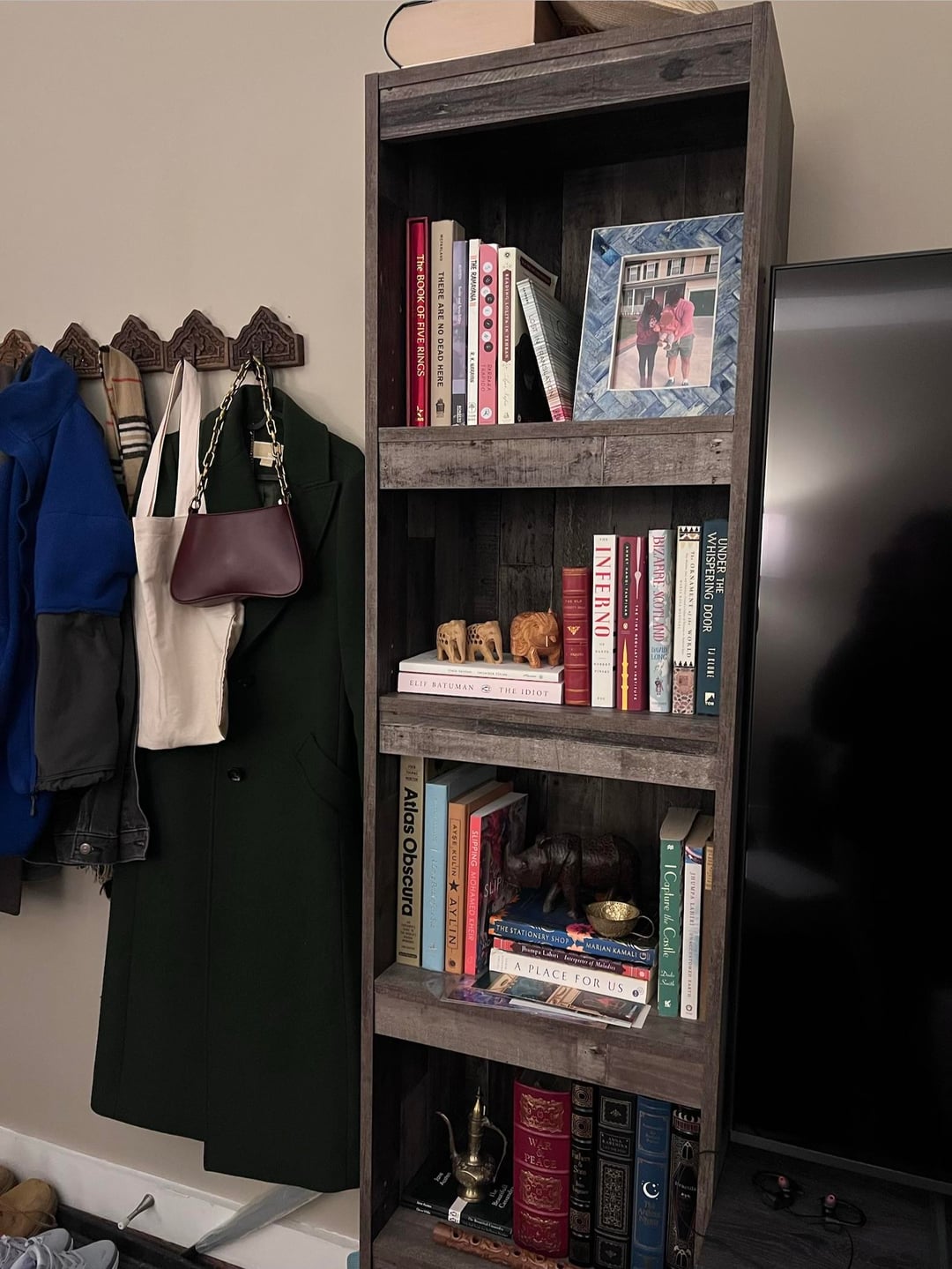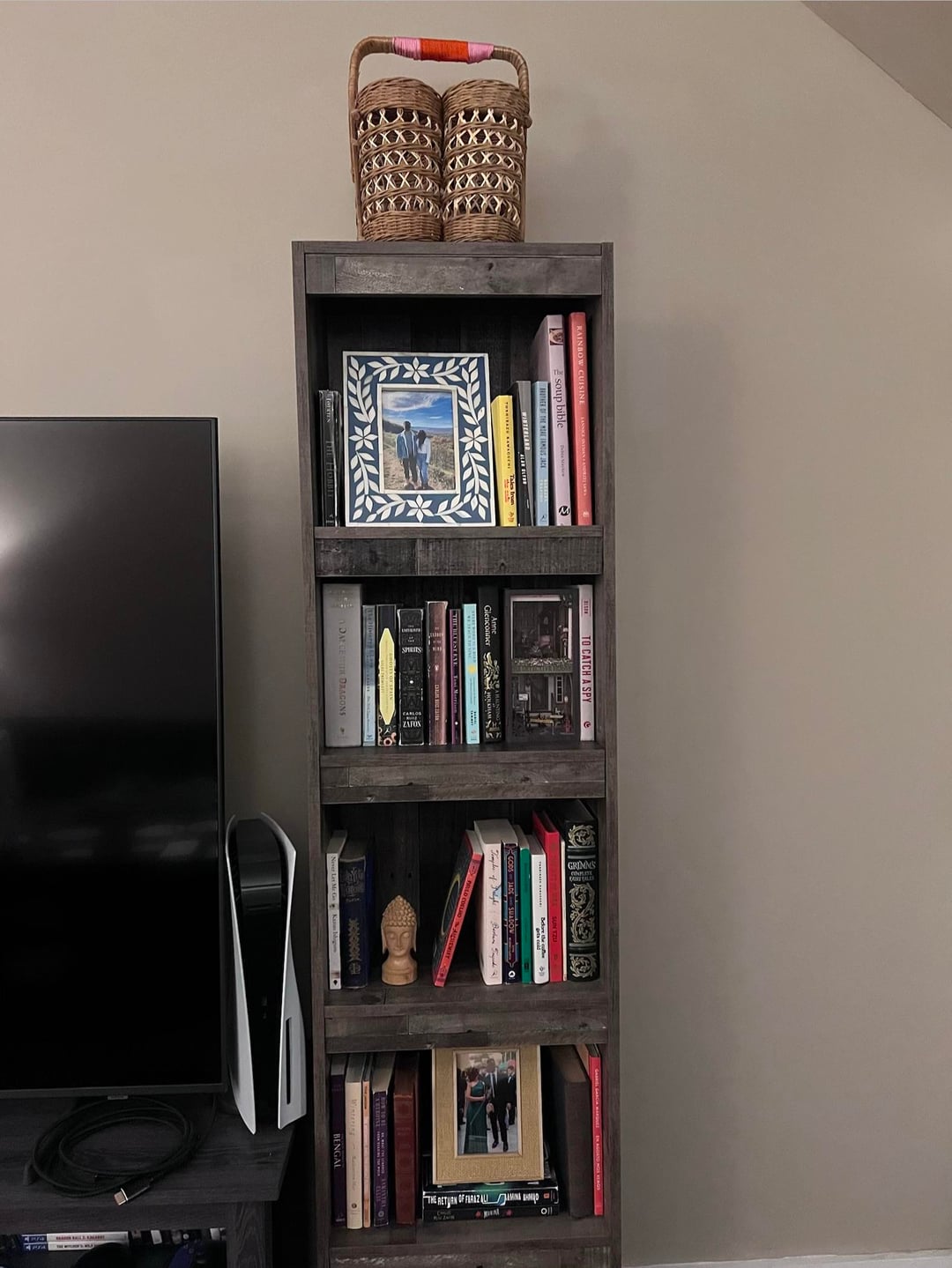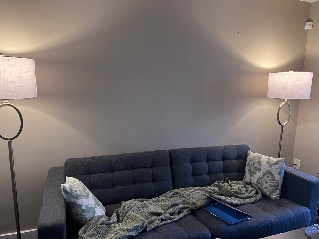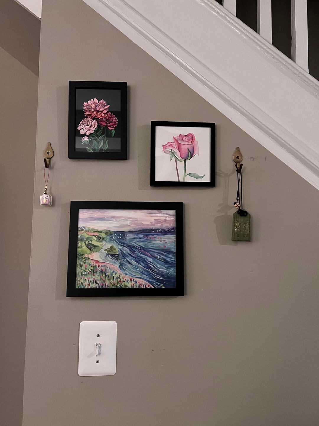 I apologize that I’m only posting small parts of the room, because the living area is quite messy and we have plans to organize more in the next couple weeks. The large paintings will be hung over the sofa soon. I bought and found a lot of decor that I liked, in colors I liked, over the past year, without really considering the colors in the big art pieces (it was easy to forget because it’s taken us so long to put them up). Every accent color in the room repeats at least once (one main shade of green, pink, yellow, multiple shades of blue that each repeat) but I’m realizing there’s no predominating color – just a lot of different colors splashed here and there. I definitely didn’t follow the 60-30-10 rule. I would appreciate any thoughts. I can also repost this once the place comes together more.