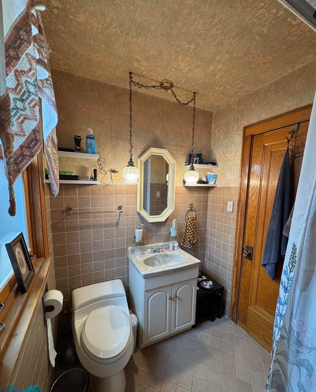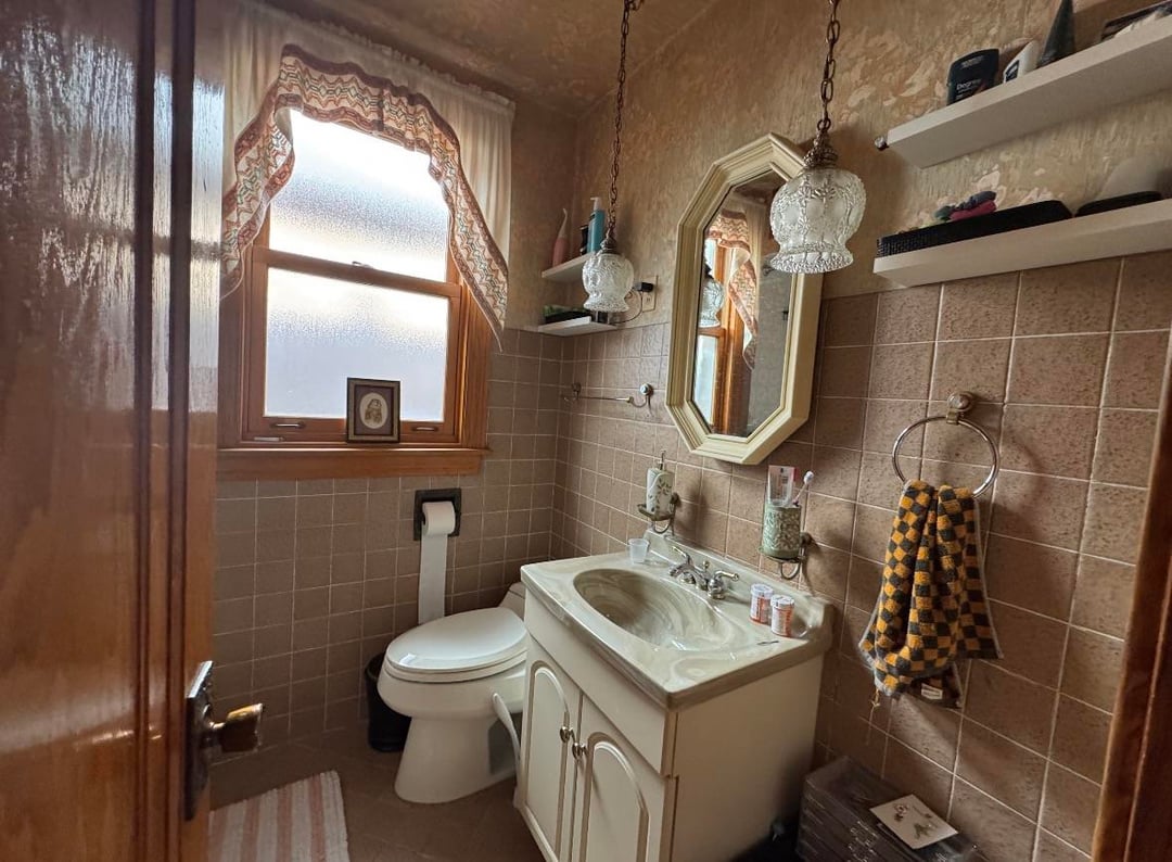 – remove wallpaper and paint (maybe light yellow or a blue?). The wall tiles are pink-ish