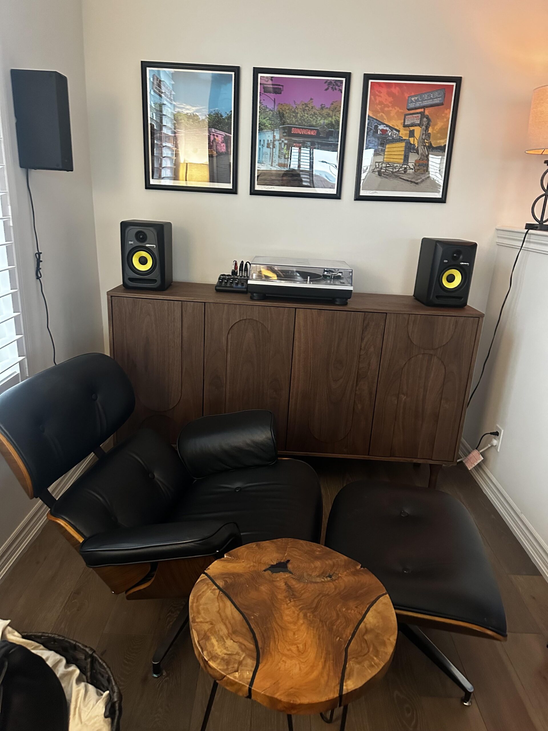Our living room is more mid century modern, with different types of wood furniture, black metal, and navy accents (dark blue wall behind tv, dark blue leather chairs for our wood dining room table). We are slowly tying everything together and recently upgraded our vinyl set up with this new sideboard, and hung some paintings. I want to spruce it up with more colour and make it more fun and would love suggestions!