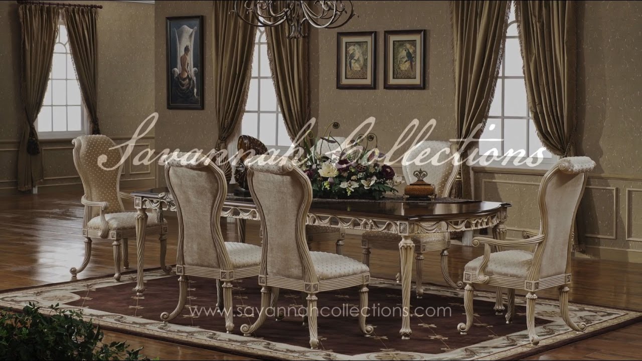Casabella 7-pc Dining Set in choice of two-tone Egyptian Pearl with Antique Cognac top or Antique Cognac finish (one-tone). Table features intricate curved legs with exquisite table apron cut-out design all painstakingly hand-crafted from high-grade hardwood. Table top features satin smooth finish highlighting the luxurious natural wood grain.