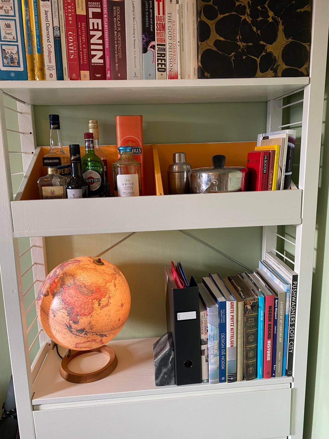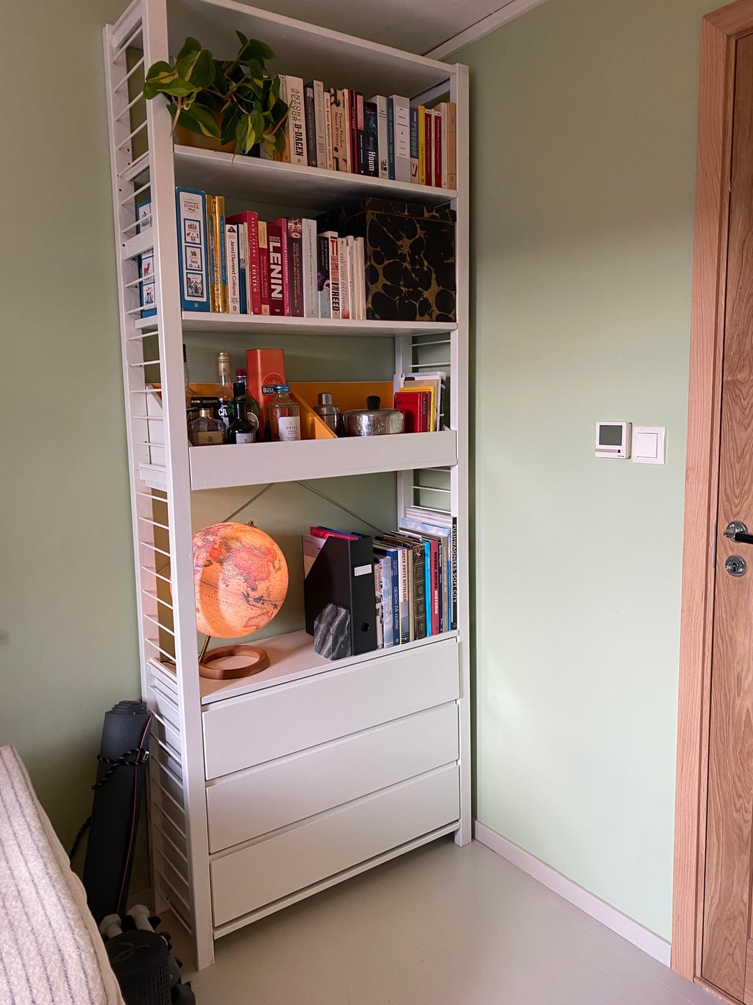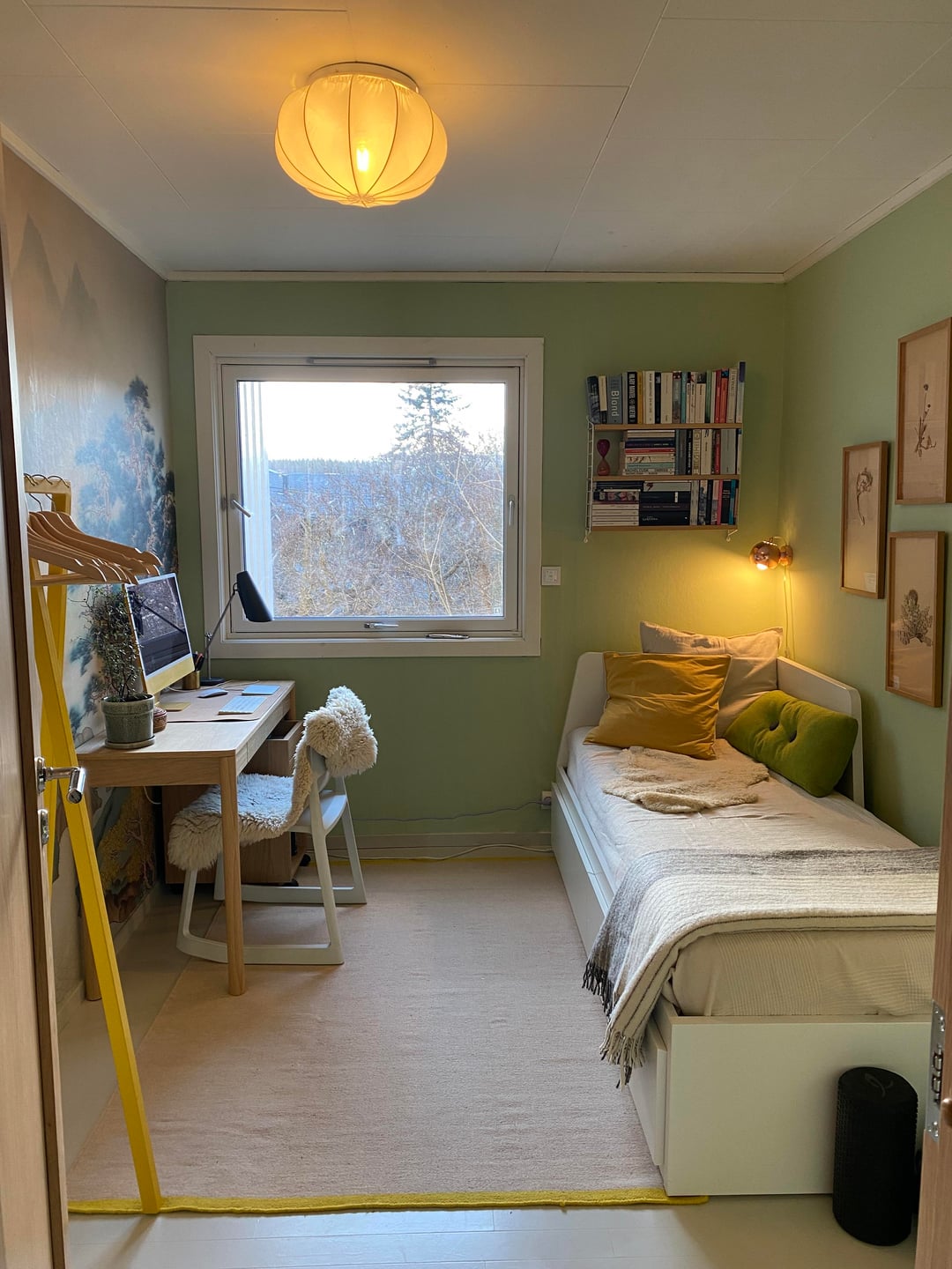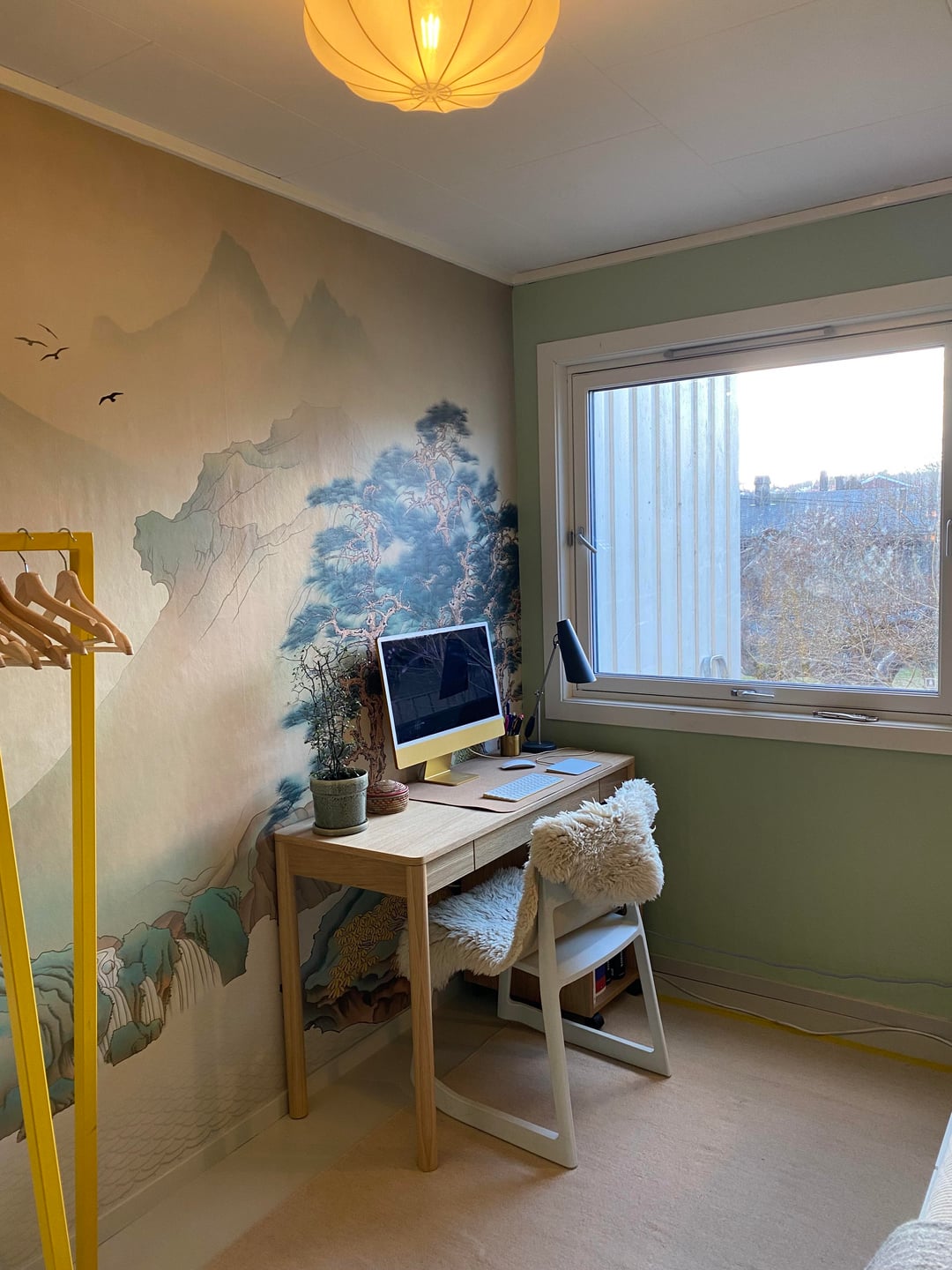 Just finished a makeover of our home office that also doubles as a guest bedroom. The room is small and a little dark so I chose a photo wallpaper to give the illusion of extra space. The walls are painted pistachio, and I kept the rest of the colour palette light and muted. Most of the furniture are from Ikea, including a hacked Ivar.
