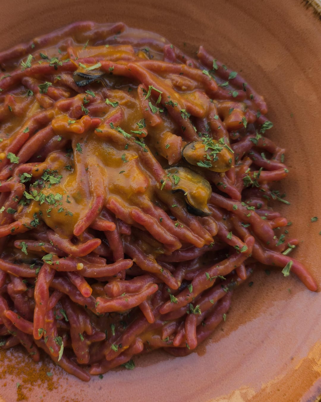 3. Pink (beetroot) trofie with mussels and ricotta