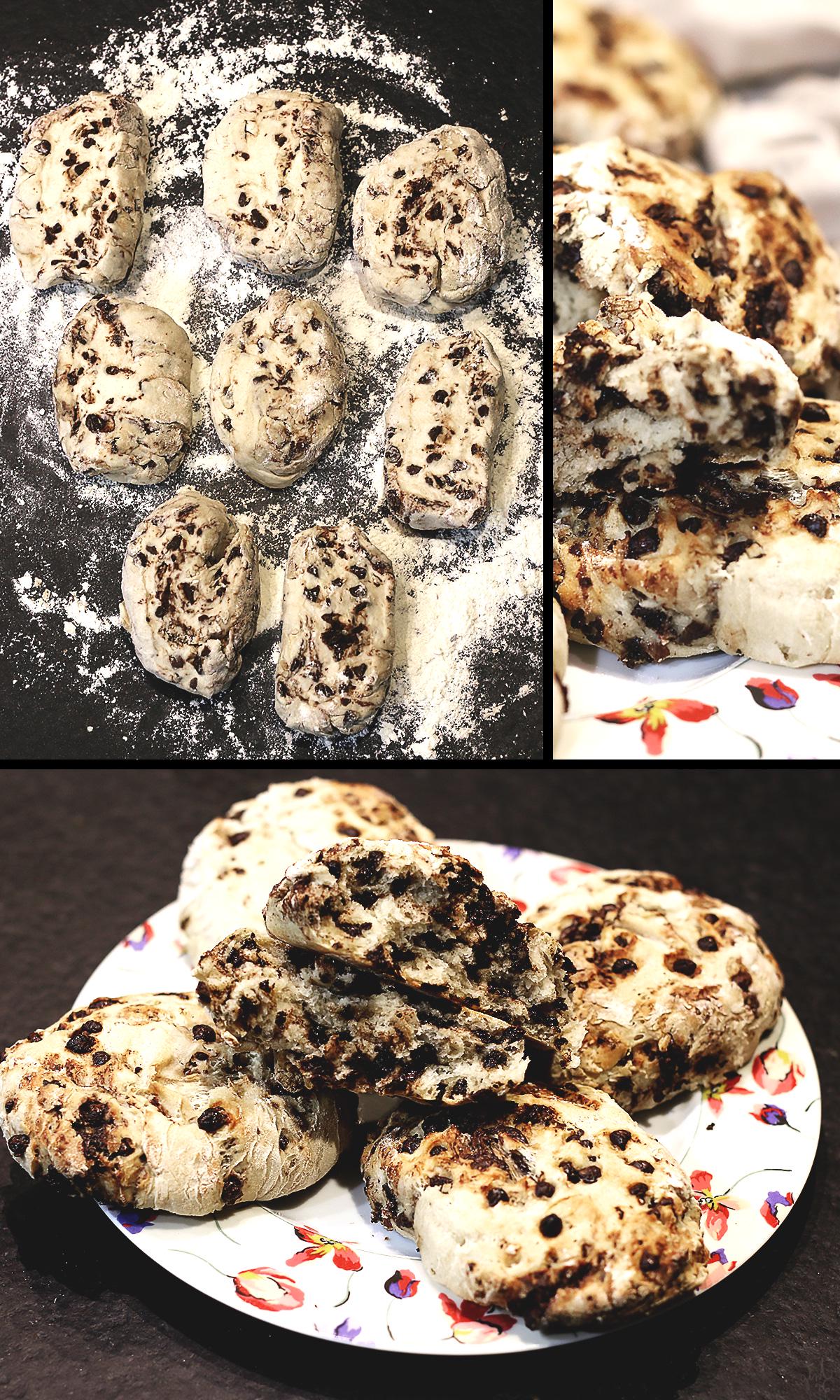 Juste de l'eau, de la levure de boulanger (sèche ou fraîche), de la farine, du sel et des pépites~