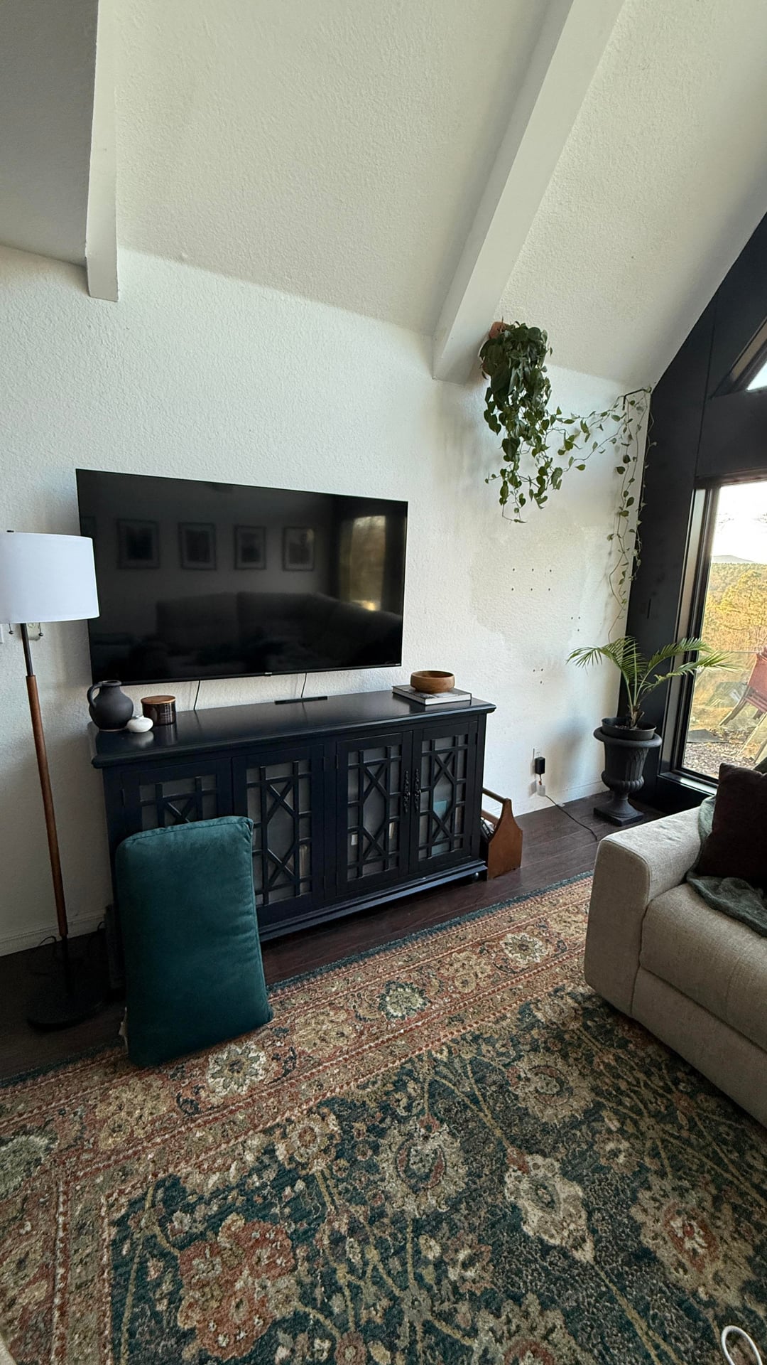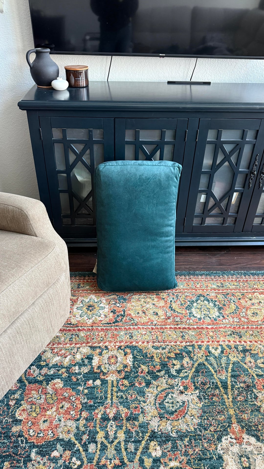 It’s a close match to the teal color in your rug which will also likely visually draw the teal out of the cabinet. So I think it will all go well together as long as you use accents that are a different shade that will complement so that the space isn’t all shades of teal.